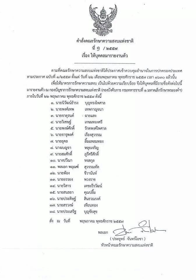 1. พลเอกประยุทธ์ จันทร์โอชา ผู้บัญชาการทหารบก เป็นหัวหน้าคณะรักษาความสงบแห่งชาติ