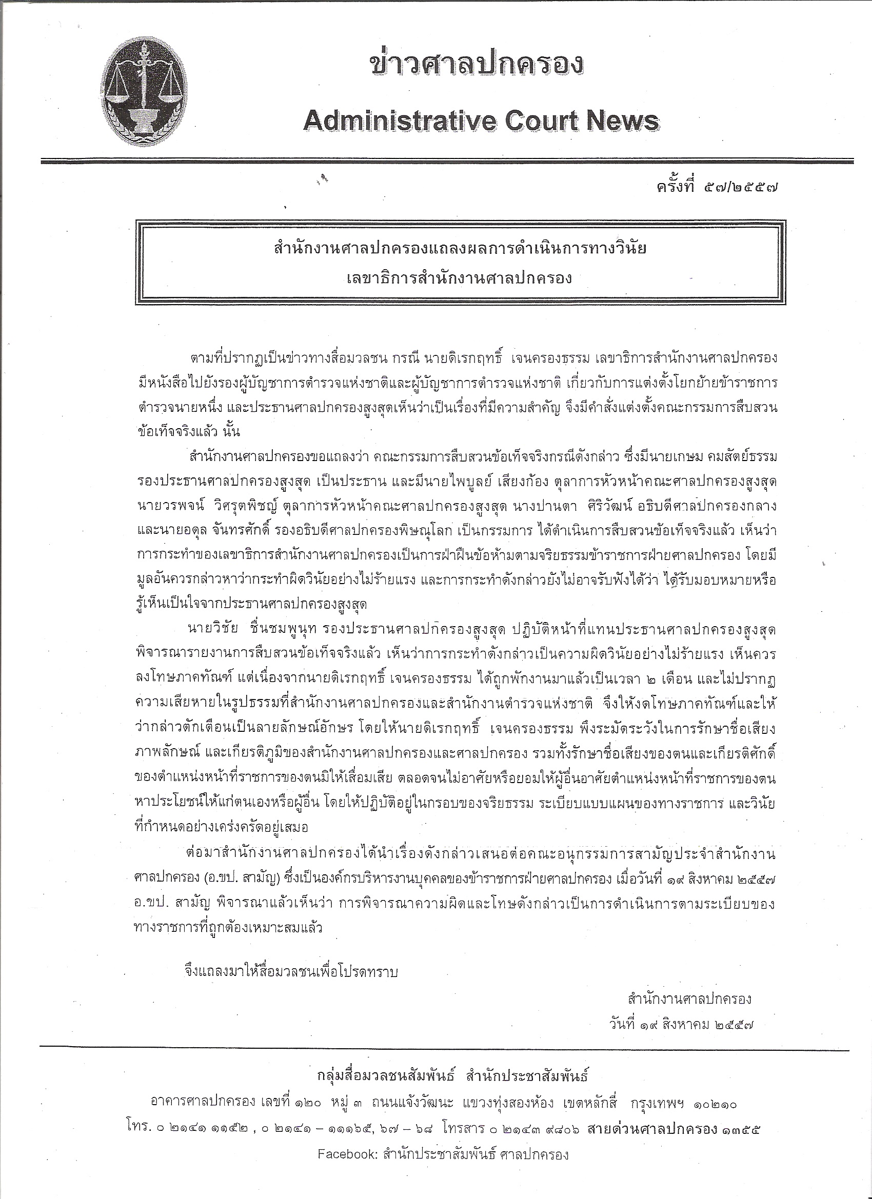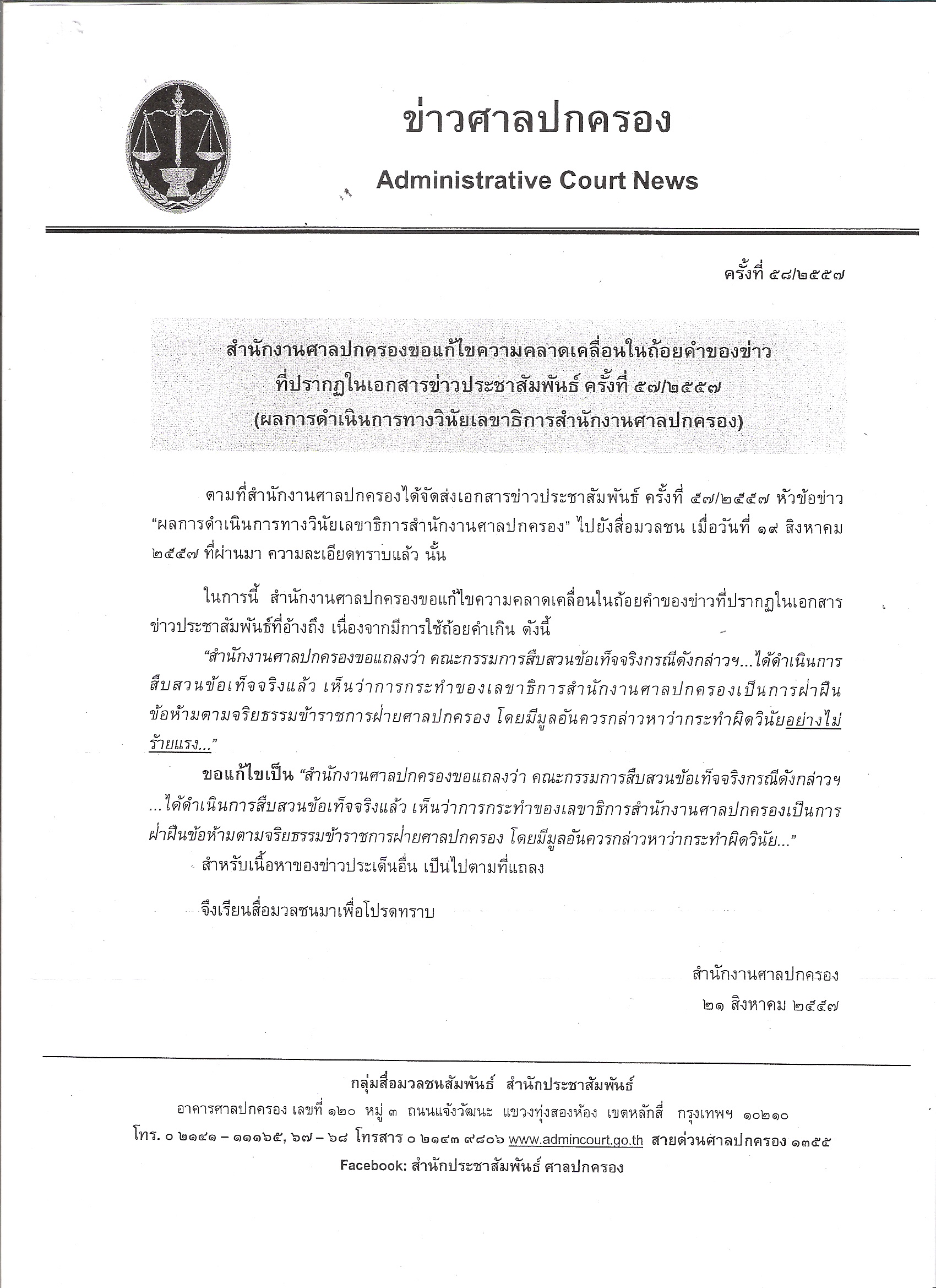 แต่ส่งมอบเอกสารแถลงข่าวศาลปกครอง ครั้งที่ 57/2557 สรุปผลสอบสวนเบื้องต้น และเอกสารแถลงข่าวศาลปกครอง ครั้งที่ 58/2557 เรื่องการแก้ไขความคลาดเคลื่อนในถ้อยคำของข่าวที่ปรากฏในเอกสารข่าวประชาสัมพันธ์ ครั้งที่ 57/2557 ให้แทน