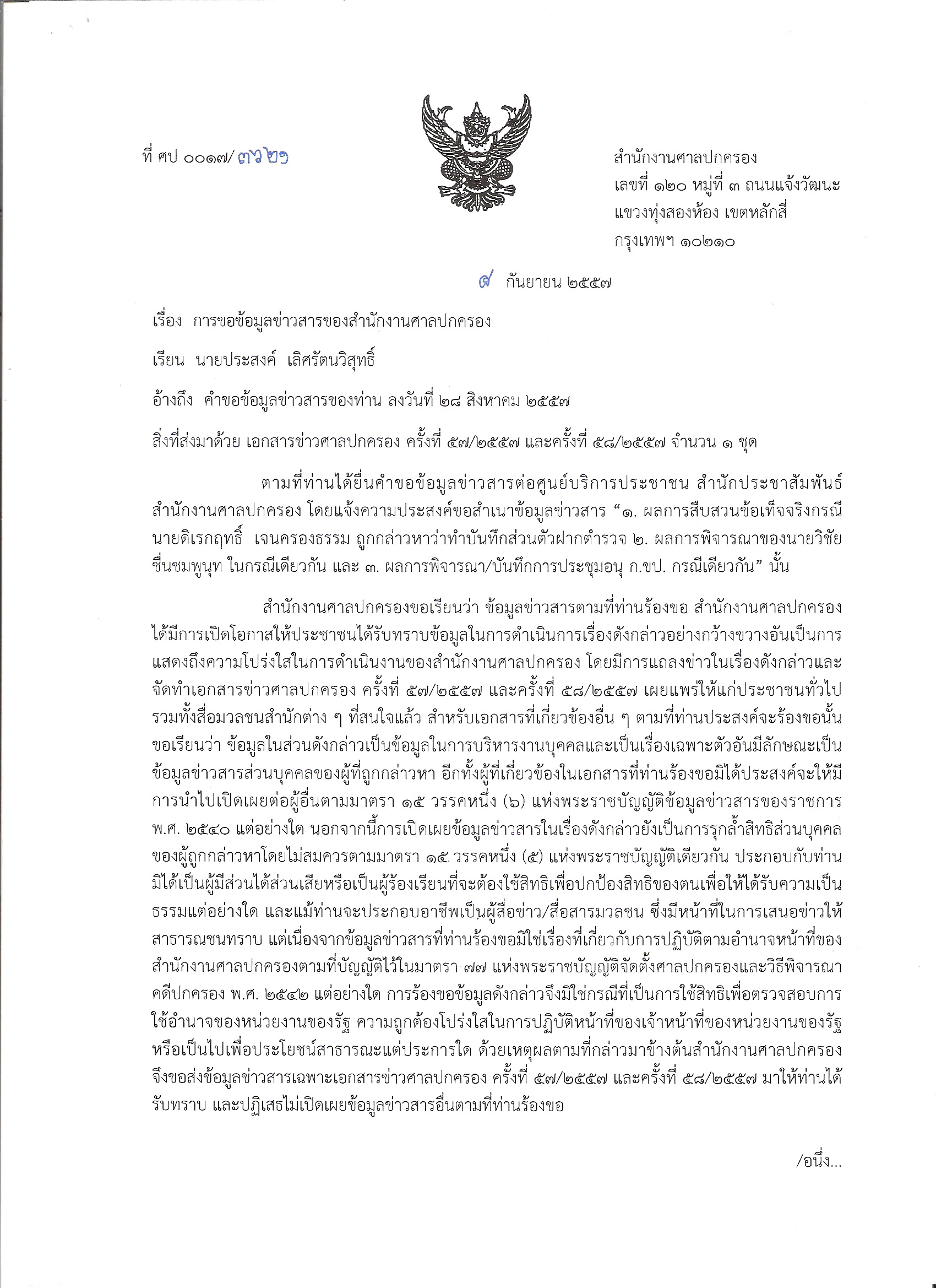 โดยหนังสือตอบกลับระบุเนื้อหาว่า สำนักงานศาลปกครองขอเรียนว่า ข้อมูลข่าวสารตามที่ท่านร้องขอ สำนักงานศาลปกครองได้มีการเปิดโอกาสให้ประชาชนได้รับทราบข้อมูลในการดำเนินการเรื่องดังกล่าวอย่างกว้างขวางอันเป็นการแสดงถึงความโปร่งใสในการดำเนินงานของสำนักงานศาลปกครอง โดยมีการแถลงข่าวในเรื่องดังกล่าวและจัดทำเอกสารข่าวศาลปกครอง ครั้งที่ 57/2557 และครั้งที่ 58 /2557 เผยแพร่ให้แก่ประชาชนทั่วไปรวมทั้งสื่อมวลชนสำนักต่างๆ ที่สนใจแล้ว
