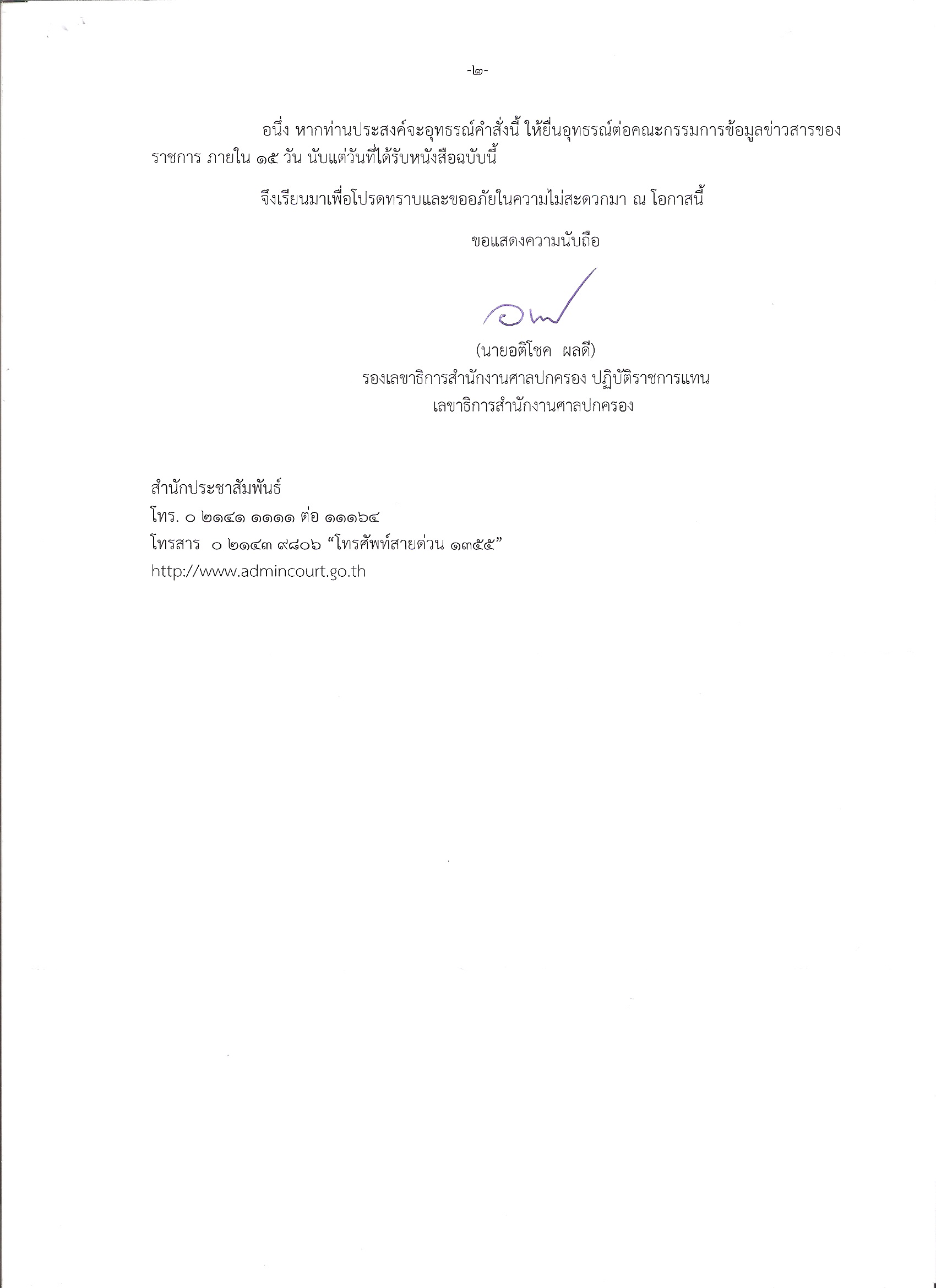 ประกอบกับท่านมิได้เป็นผู้มีส่วนได้ส่วนเสียหรือเป็นผู้ร้องเรียนที่จะต้องใช้สิทธิเพื่อปกป้องสิทธของตนเพื่อให้ได้รับความเป็นธรรมแต่อย่างใด และแม้ท่านจะประกอบอาชีพเป็นผู้สื่อข่าว/สื่อสารมวลชน ซึ่งมีหน้าที่ในการเสนอข่าวให้สาธารณชนทราบ แต่เนื่องจากข้อมูลข่าวสารที่ท่านร้องขอมิใช่เรื่องที่เกี่ยวกับการปฏิบัติตามอำนาจหน้าที่ของสำนักงานศาลปกครองตามที่บัญญัติไว้ในมาตรา 77 แห่งพรบ.จัดตั้งศาลปกครองและวิธีพิจารณาคดีปกครอง พ.ศ.2540 แต่อย่างใด