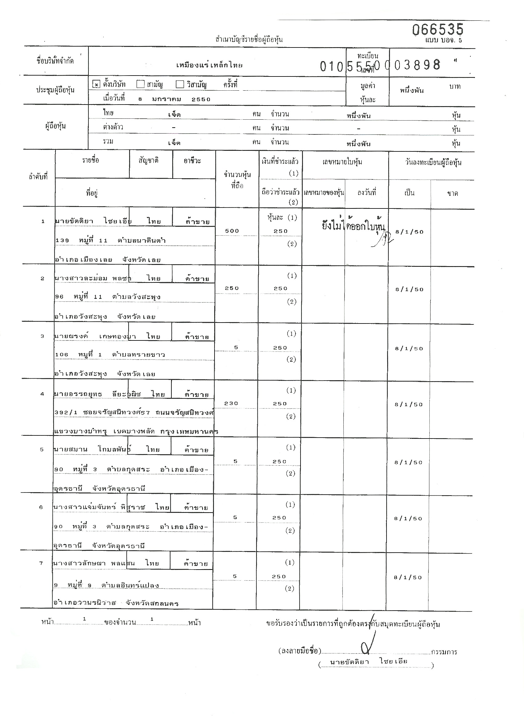 บริษัท เอ แอนด์ โอ คอนสตรัคชัน จำกัด จดทะเบียนวันที่ 4 ม.ค.56 ทุน 1 ล้านบาท ทุน 1 ล้านบาท นายสมคิด พลซา ถือ 4,000 หุ้น นายณรงค์ เกษทองมา 3,000 หุ้น นางสาวมารศรี ใจซื่อ 2,999 หุ้น (ดูเอกสาร)