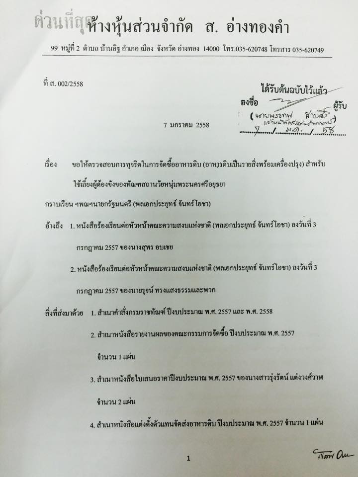 เมื่อ 7 ม.ค.58 ที่ผ่านมา นายสายัณ อบเชย เจ้าของห้างหุ้นส่วนจำกัด ส.อ่างทองคำ ได้เข้ายื่นหนังสือถึงนายกรัฐมนตรีผ่านจุดบริการประชาชน 1111 ทำเนียบรัฐบาล (สำนักงานชั่วคราว อาคารสำนักงาน ก.พ.) เพื่อขอให้สั่งการหน่วยงานที่เกี่ยวข้องตรวจสอบข้อเท็จจริงการจัดซื้ออาหารดิบของกรมราชทัณฑ์ใน 2 กรณี