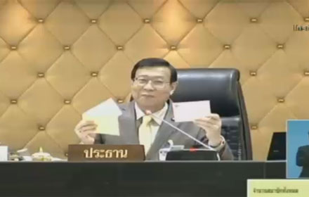 นายพรเพชร วินิจฉัยว่า มีบางกรณีที่บางท่านจะบอกว่า ท่านไม่ประสงค์จะลงคะแนน หรืองดออกเสียง ถ้าไปค้นลึก ๆ อาจเกี่ยวพันเป็นญาติกับคู่กรณี และสามารถทำสิทธิ์เช่นนั้นได้ จึงเห็นว่าอย่าปล่อยให้เป็นบัตรเสีย มิฉะนั้นเสียภาพต่อ สนช. เมื่อเห็นว่าผลประโยชน์ไม่ถูกต้อง มีสิทธิ์ไม่ลงคะแนน ขอให้กรรมการนัดคะแนนจัดการไม่กากบาทช่องอะไรเลย คือการงดออกเสียง แต่ถ้าไปเขียนเครื่่องหมายอื่นใด หรือกากบาททั้งสองช่องให้ถือว่าเป็นบัตรเสีย