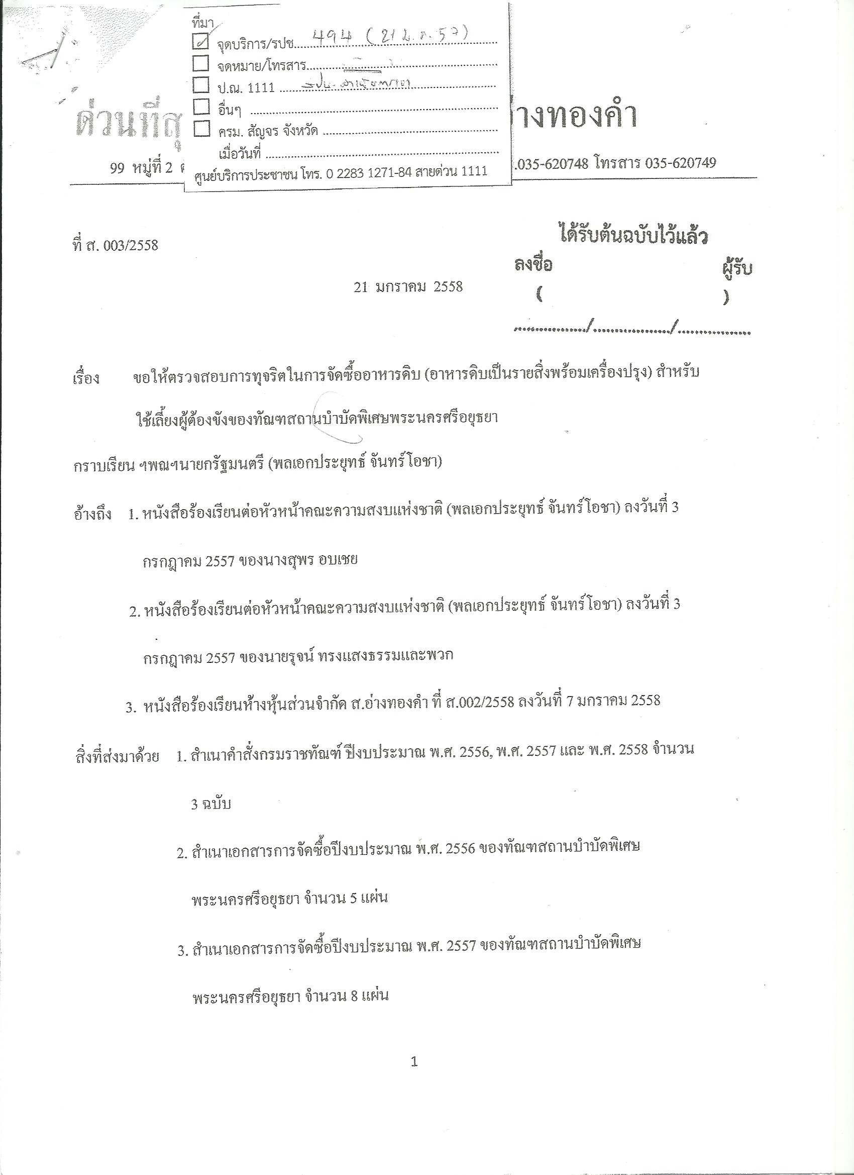 สำนักข่าวอิศรา www.isranews.org รายงาน เมื่อวันที่ 21 ม.ค.58 ที่ผ่านมา ห้างหุ้นส่วนจำกัด ส.อ่างทองคำ ได้ยื่นหนังสือถึง พล.อ.ประยุทธ์ จันทร์โอชา นายกรัฐมนตรี ผ่านมาศูนย์บริการประชาชนสำนักปลัดนายกรัฐมนตรี ให้ตรวจสอบการจัดซื้ออาหารของทัณฑสถานบำบัดพิเศษพระนครศรีอยุธยาในช่วงปี 2556-2558 เนื่องจากส่อว่ามีการสมยอมราคาเพื่อเอื้อประโยชน์ให้ผู้เสนอราคาบางราย