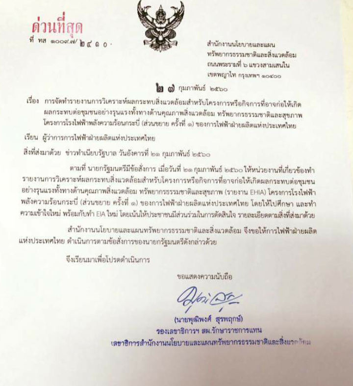 วันที่ 27 กุมภาพันธ์ 2560 พลโท สรรเสริญ แก้วกำเนิด โฆษกประจำสำนักนายกรัฐมนตรี เปิดเผยถึงความคืบหน้าล่าสุดกรณีการก่อสร้างโรงไฟฟ้าถ่านหิน จ.กระบี่ ว่า พลเอก ประยุทธ์ จันทร์โอชา นายกรัฐมนตรี ได้สั่งการให้สำนักงานนโยบายและแผนทรัพยากรธรรมชาติและสิ่งแวดล้อม (สผ.) กระทรวงทรัพยากรธรรมชาติและสิ่งแวดล้อม มีหนังสือไปถึงกระทรวงพลังงาน เพื่อแจ้งให้การไฟฟ้าฝ่ายผลิตแห่งประเทศไทย (กฟผ.) "ยกเลิก"ผลการวิเคราะห์ผลกระทบสิ่งแวดล้อม (EIA) และผลการวิเคราะห์ผลกระทบสิ่งแวดล้อมและสุขภาพ (EHIA) ที่ได้ดำเนินการไปก่อนหน้านี้ โดยนายกรัฐมนตรีเป็นห่วงเรื่องกระบวนการมีส่วนร่วมของประชาชนที่ต้องดำเนินการอย่างโปร่งใส ซึ่งเป็นสิ่งที่รัฐบาลให้ความสำคัญเป็นอย่างมาก