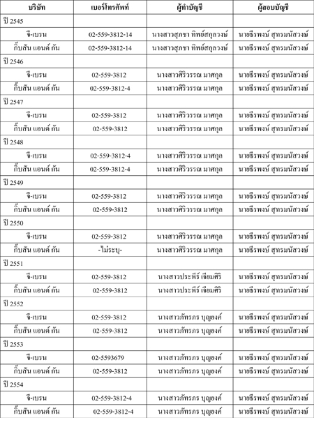 จากการตรวจสอบข้อมูลแบบนำส่งงบการเงิน บริษัท จี-เบรน จำกัด ที่นำส่งให้กรมพัฒนาธุรกิจการค้า ตั้งแต่ปี 2545 -2554 พบว่า มีการระบุเบอร์โทรศัพท์ติดต่อ รายชื่อผู้ทำบัญชี และสอบบัญชี เหมือนกับ บริษัท กิ๊บสัน แอนด์ กัน จำกัด