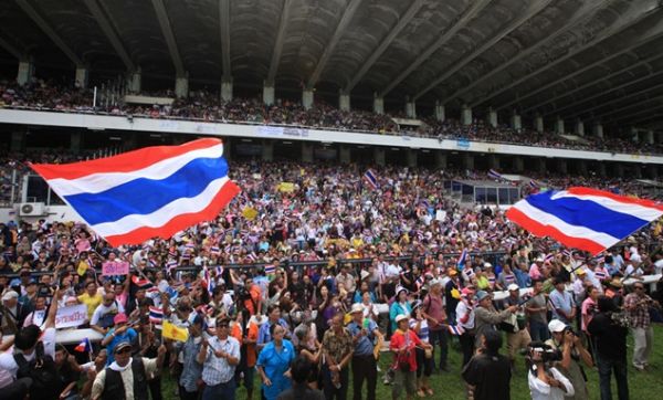 บรรยายภาพ: วันที่ 28 ตุลาคม 2555 มีการรวมตัวกันครั้งแรกโดยกลุ่มผู้ชุมนุมต่อต้านรัฐบาลในสนามกีฬาเพื่อเรียกร้องให้พรรคเพื่อไทยลาออกจากอำนาจ ถึงแม้ว่าการชุมนุมประท้วงนี้จะใช้แนวคิดแบบ “สปริง” ที่ได้ผลในช่วงปี 2011-2012 แต่การประท้วงกลับไม่ได้รับการรายงานในสื่อต่างชาติ เพราะว่านี่เป็นการประท้วงที่ต้องการขับไล่รัฐบาลที่โลกตะวันตกหนุนหลัง ไม่ใช่การขับไล่เพื่อตั้งรัฐบาลที่โลกตะวันตกหนุนหลัง