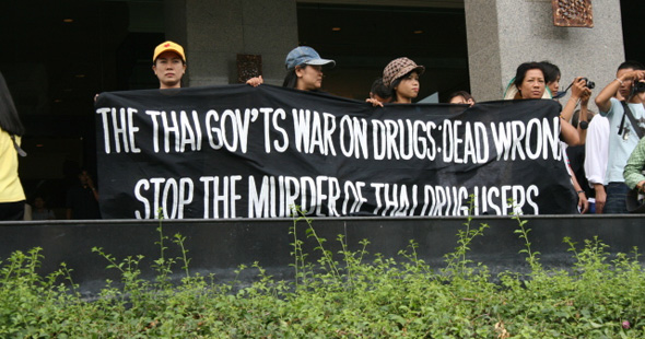 บรรยายภาพ: “สงครามต่อต้านยาเสพติดของรัฐบาล: ผิดอย่างร้ายแรง หยุดการฆาตกรรมผู้ใช้ยาเสพติดชาวไทย” ในช่วง “สงครามต่อต้านยาเสพติด” ของทักษิณ ชินวัตร ในปี 2546 ไม่เพียงแต่ผู้ใช้ยาเสพติดเท่านั้นที่ถูกวิสามัญฆาตรกรรมอย่างโหดร้ายทารุณนอกกฎหมายบนท้องถนน แต่เหยื่อจำนวนมากกว่า 50% ของจำนวนผู้ที่ถูกฆาตรกรรมไปในเวลา 3 เดือนนั้นคือผู้บริสุทธิ์และไม่ได้มีส่วนเกี่ยวข้องใด ๆ เลยกับการใช้ยาเสพติดหรือว่าการค้ายา