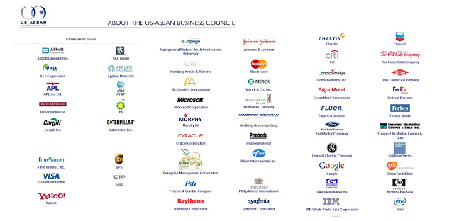 บรรยายภาพ: สภาธุรกิจสหรัฐ-อาเซียน—บริษัทชั้นแนวหน้าที่เปรียบได้กับเป็นกลุ่มบริษัทเผด็จการชาตินิยมในสหรัฐ—ได้รับการติดต่อจากแกนนำม็อบป่วนถนน “เสื้อแดง” ของทักษิณ ชินวัตร