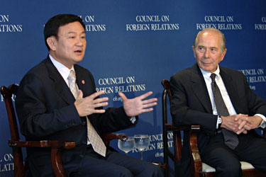 ทักษิณอยู่ในตำแหน่งนายกรัฐมนตรีถึงเดือนกันยายนปี 2549 โดยก่อนหน้าที่จะเกิดรัฐประหารโค่นเขาออกจากอำนาจนั้น ทักษิณกำลังกล่าวรายงานความคืบหน้าต่อสภาความสัมพันธ์ระหว่างประเทศที่ได้รับการสนับสนุนทางการเงินจากกลุ่มบริษัทที่อยู่ในรายชื่อ Fortune 500 ในกรุงนิวยอร์ค ซึ่งบริษัทที่อยู่ในรายชื่อดังกล่าวได้แก่บริษัทที่มีรายได้จากการประกอบการสูงสุดในประเทศสหรัฐอเมริกาในแต่ละปี