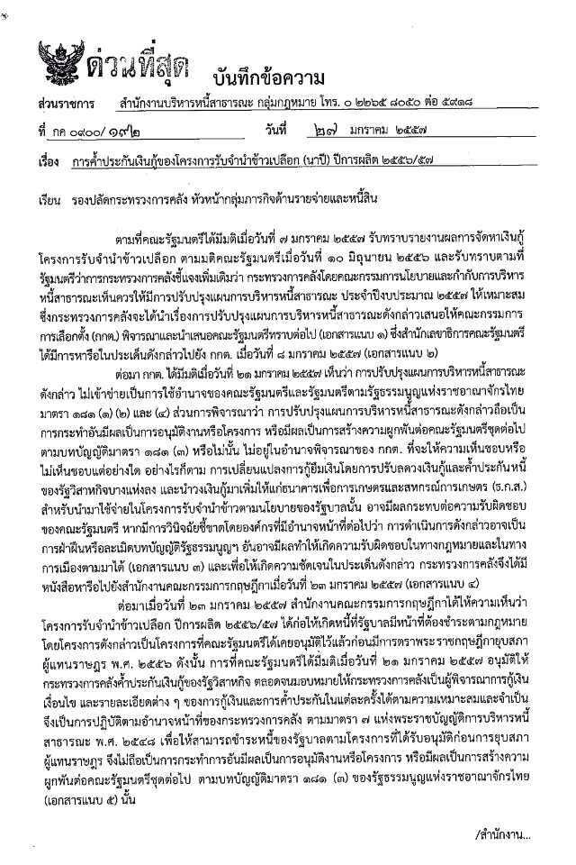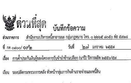 สำนักข่าวอิศรา www.isranews.org ตรวจสอบพบว่า เมื่อวันที่ 27 มกราคม 2557 ที่ผ่านมา นางสาวจุฬารัตน์ สุธีธร ผู้อำนวยการสำนักงานบริหารหนี้สาธารณะ ได้ทำบันทึกข้อความ ด่วนที่สุด เลขที่ กค 0900/192 ถึงรองปลัดกระทรวงการคลัง หัวหน้ากลุ่มภารกิจด้านรายจ่ายและหนี้สิน เพื่อขอให้นำเรียนข้อสังเกตต่อรัฐมนตรีว่าการกระทรวงการคลัง ต่อกรณีการค้ำประกันเงินกู้โครงการรับจำนำข้าวเปลือก (นาปี) ปีการผลิต 2556/2557