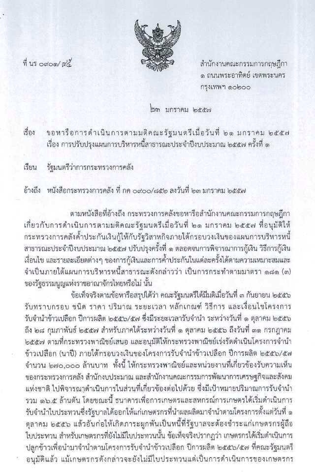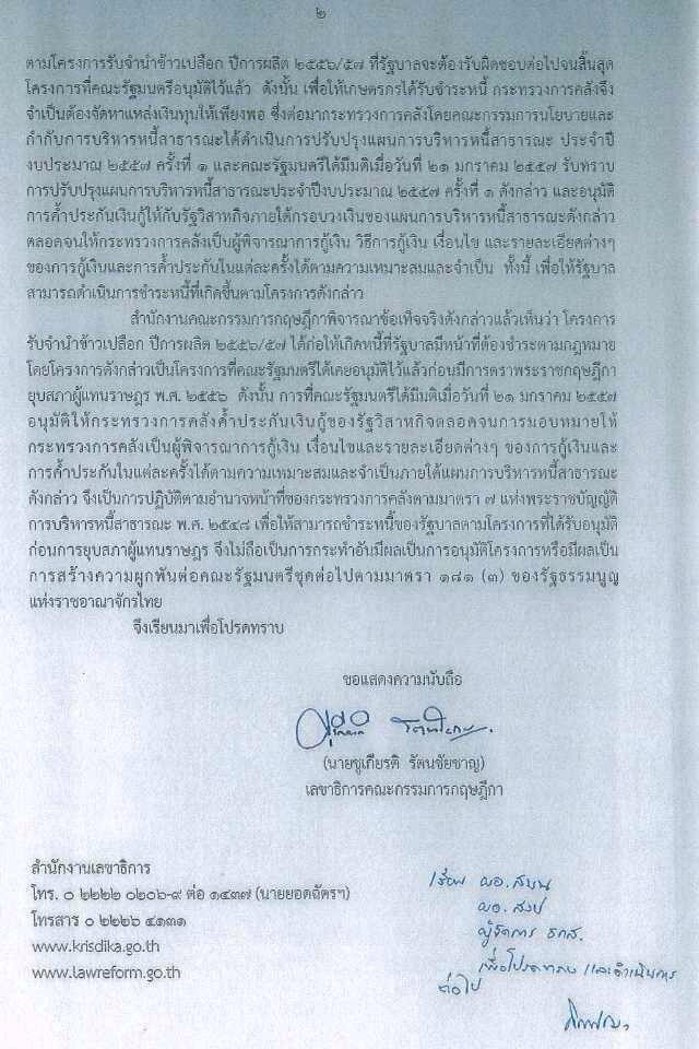 แต่สำนักงานคณะกรรมการกฤษฎีกาได้ให้ความเห็นว่า “โครงการรับจำนำข้าวเปลือกปีการผลิต 2556/2557 ได้ก่อให้เกิดหนี้ที่รัฐบาลมีหน้าที่ต้องชำระตามกฎหมาย โดยโครงการดังกล่าวเป็นโครงการที่คณะรัฐมนตรีได้เคยอนุมัติไว้แล้วก่อนมีการตราพระราชกฤษฎีกายุบสภาผู้แทนราษฎรพ.ศ.2556 ดังนั้น การที่คณะรัฐมนตรีได้มีมติเมื่อวันที่ 21 มกราคม 2557 อนุมัติให้กระทรวงการคลังค้ำประกันเงินกู้ของรัฐวิสาหกิจ ตลอดจนมอบหมายให้กระทรวงการคลังเป็นผู้พิจารณาการกู้เงิน เงื่อนไขและรายละเอียดต่างๆ ของการกู้เงินและการค้ำประกันในแต่ละครั้งได้ตามความเหมาะสม และจำเป็น (ดูหนังสือเชิญชวนธนาคารประกอบท้ายเรื่อง) จึงเป็นการปฏิบัติตามอำนาจหน้าที่ของกระทรวงการคลัง ตามมาตรา 7 แห่งพระราชบัญญัติการบริหารหนี้สาธารณะ พ.ศ.2548 เพื่อให้สามารถชำระหนี้ของรัฐบาลตามโครงการที่ได้รับอนุมัติก่อนการยุบสภาผู้แทนราษฎร จึงไม่ถือเป็นการกระทำการอันมีผลเป็นการอนุมัติงานหรือโครงการหรือมีผลเป็นการสร้างความผูกพันต่อคณะรัฐมนตรีชุดต่อไปตามบทบัญญัติมาตรา 181(3) ของรัฐธรรมนูญแห่งราชอาณาจักรไทย” (ดูเอกสารฉบับเต็มประกอบท้ายเรื่อง)
