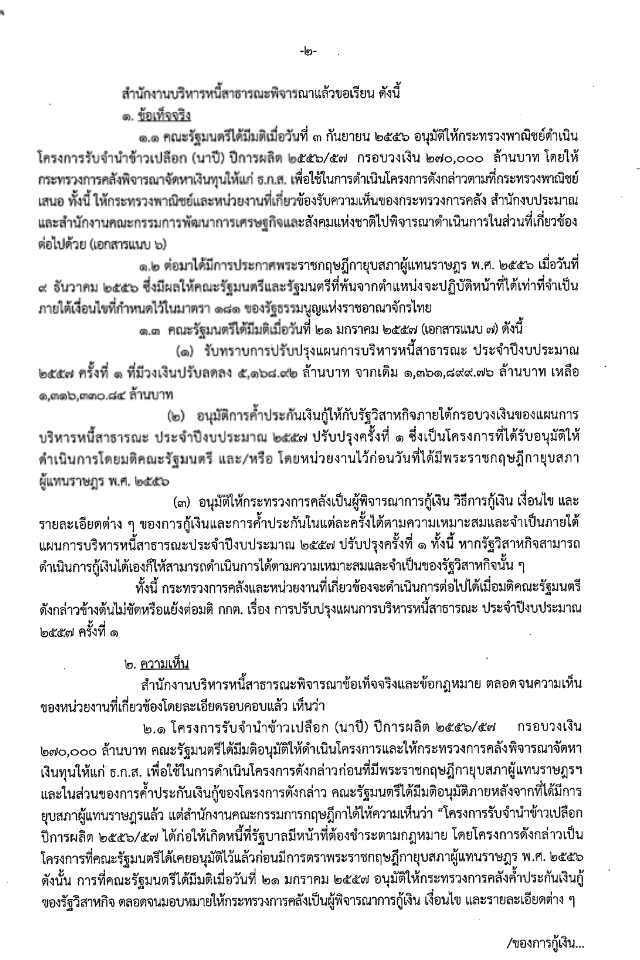 2.1 โครงการรับจำนำข้าวเปลือก (นาปี) ปีการผลิต2556/2557 กรอบวงเงิน270,000 ล้านบาท คณะรัฐมนตรีได้มีมติอนุมัติให้ดำเนินโครงการและให้กระทรวงการคลังพิจารณาจัดหาเงินทุนให้กับ ธ.ก.ส. เพื่อใช้ในการดำเนินโครงการดังกล่าวก่อนที่มีพระราชกฤษฎีกายุบสภาผู้แทนราษฎรฯ และในส่วนของการค้ำประกันเงินกู้ของโครงการดังกล่าว คณะรัฐมนตรีได้มีมติอนุมัติภายหลังจากที่ได้มีการยุบสภาผู้แทนราษฎรแล้ว