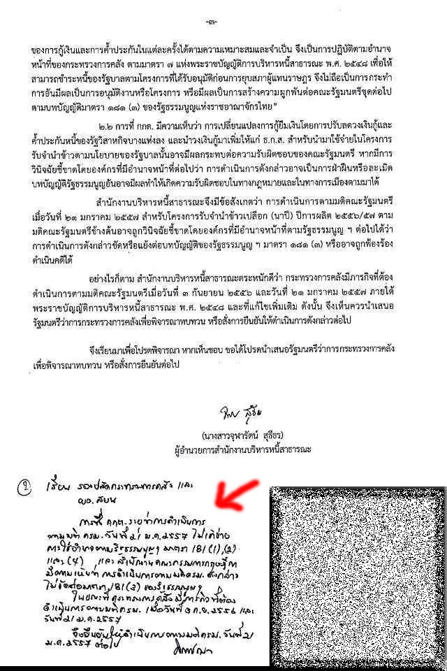 สำนักงานบริหารหนี้สาธารณะ จึงมีข้อสังเกตว่า การดำเนินการตามมติคณะรัฐมนตรีเมื่อวันที่ 21 มกราคม 2557 สำหรับโครงการรับจำนำข้าวเปลือก (นาปี) ปีการผลิต2556/2557 ตามมติคณะรัฐมนตรีข้างต้น อาจถูกวินิจฉัยชี้ขาดโดยองค์กรที่มีอำนาจหน้าที่ตามรัฐธรรมนูญ ฯ ต่อไปได้ว่าการดำเนินการดังกล่าวขัดหรือแย้งต่อบทบัญญัติของรัฐธรรมนูญฯ มาตรา181(3) หรืออาจถูกฟ้องร้องดำเนินคดีได้