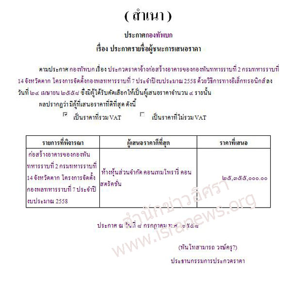 ล่าสุดพบว่า โครงการประกวดราคาก่อสร้างอาคารของกองพันทหารราบที่ 2 กรมทหารราบที่ 14 จังหวัดตาก โครงการจัดตั้งกองพลทหารราบที่ 7 ประจำปีงบประมาณ 2558 ราคากลาง 25,411,400 บาท ซึ่ง หจก. คอนเทมโพรารี คอนสตรัคชั่น เป็นผู้ชนะประกวดราคาด้วยวิธีการทางอิเล็กทรอนิกส์โดยผ่านผู้ให้บริการตลาดกลาง (อีอ๊อกชั่น) นั้น ชนะคู่แข่ง 3 ราย ด้วยวงเงิน 1,900- 3,900 บาท มีรายละเอียดดังนี้