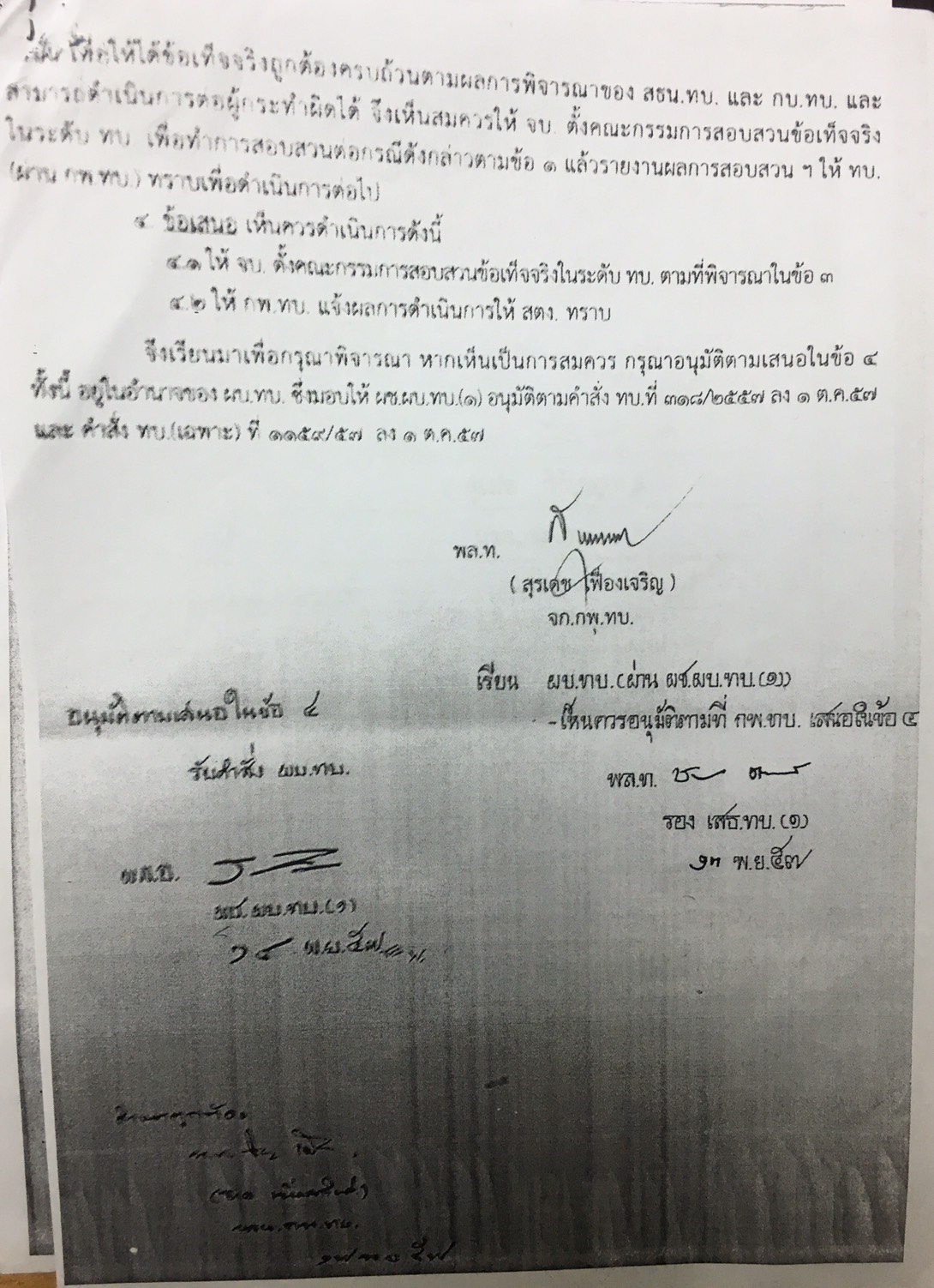 กพ.ทบ.พิจารณาแล้วเห็นว่า ตามรายงานผลการสอบสวนฯของ ขส.ทบ. ได้พิจารณาลงทัณฑ์ทางวินัยกับกำลังพลที่เกี่ยวข้อง โดยมิได้ทำการสอบสวนให้ได้ความชัดเจนว่ากำลังพลที่เกี่ยวข้องกระทำการอันมีมูลความผิดในทางอาญาฐานใด หรือไม่ อย่างไร และจากผลการพิจารณาของ สธน.ทบ. และ กบ.ทบ. ก็ไม่สามารถ นำข้อเท็จจริงตามรายงานผลการสอบสวนฯ ของ ขส.ทบ. มาพิจารณาได้