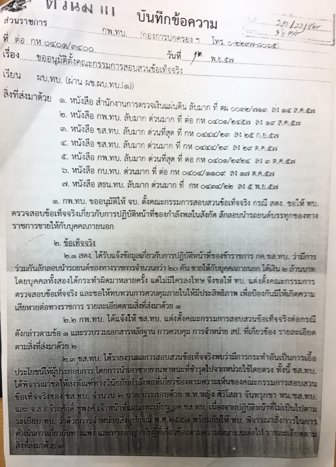 สตง.ได้รับแจ้งข้อมูลเกี่ยวกับการปฏิบัติหน้าที่ของข้าราชการ กค.ขส.ทบ. ว่ามีการร่วมกันลักลอบนำรถยนต์ของทางราชการจำนวนกว่า 20 คัน ขายให้กับบุคคลภายนอก ได้เงิน 2 ล้านบาท โดยบุคคลทั้งสองได้ทำผิดมาหลายครั้ง แต่ไม่มีใครลงโทษ จึงขอให้ ทบ. แต่งตั้งคณะกรรมการตรวจสอบข้อเท็จจริง และขอให้ทบทวนการควบคุมภายในให้มีประสิทธิภาพ เพื่อป้องกันมิให้เกิดความเสียหายต่อทางราชการ