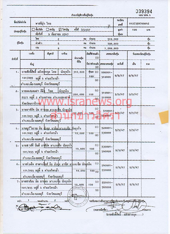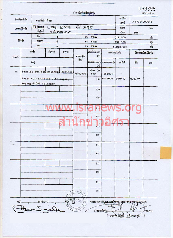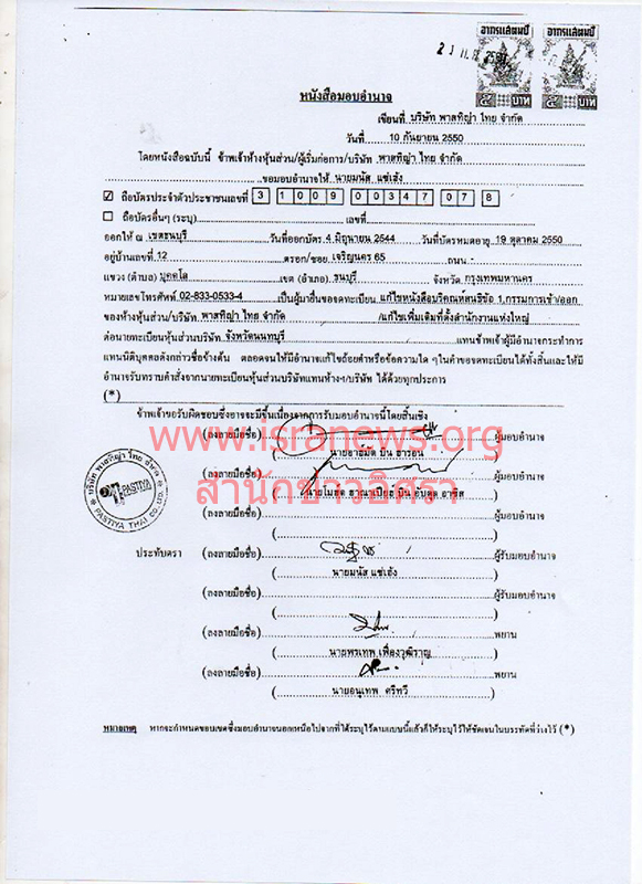 3.ในการจดทะเบียนย้ายที่ตั้ง บริษัท พาสทิญ่า ไทย จำกัด จาก เลขที่ 96/9 ชั้น 2-4 หมู่ 5 ถ.รัตนาธิเบศร์ อ.เมืองนนทบุรี เป็น เลขที่ 444 อาคารโอลิมเปียไทย ชั้น 3 ถ.รัชดาภิเษก แขวงสามเสนนอก เขตห้วยขวาง กรุงเทพฯ เมื่อวันที่ 10 ก.ย.2550 นายอาฮ์มัด บิน ฮารอน และ นายโมฮิด ฮาณาเปียฮ์ บิน อับดุล อาซิส กรรมการบริษัทฯ มอบอำนาจให้ นายมนัส แซ่เฮ้ง อยู่บ้านเลขที่ 12 ซอยเจริญนคร 65 แขวงบุคคโล เขตธนบุรี กรุงเทพฯ เป็นผู้ยื่นจดทะเบียนต่อนายทะเบียนหุ้นส่วนจังหวัดนนทบุรี (ดูเอกสาร)