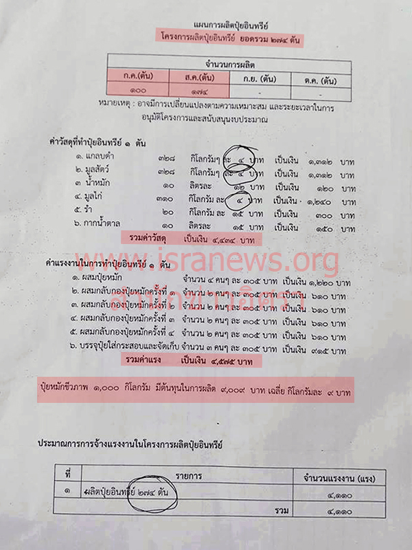 “..มูลสัตว์ ราคา กก.ละ 4 บาท 90,000 กก. 360,000 บาท.. แกลบดำ กก.ละ 4 บาท 90,000 กก. 360,000 บาท.. รำ กก.ละ 15 บาท 3,000 กก. 55,000 บาท.. มูลไก่ กก.ละ 4 บาท 85,000 กก. 340,000 บาท.. กากน้ำตาล กก.ละ 15 บาท 3,000 กก. 55,000 บาท.. รวมค่าวัสดุกว่า 1.2 ล้านบาท..”