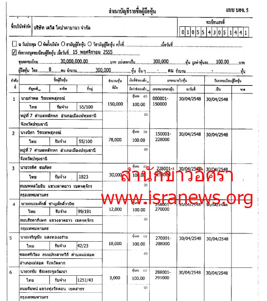 30 เม.ย.2558 นายกำพล ได้โอนหุ้นที่ถือครอง จำนวน 150,000 หุ้นไปให้ นายธิติพัฒน์ ธิติพันธุ์ อยู่บ้านเลขที่ 88/15 หมู่ที่ 7 ต.หลักหก อ.เมืองปทุมธานี จ.ปทุมธานี ขณะที่ นางนิภา ได้โอนหุ้นที่ถือครอง จำนวน 78,000 หุ้น ไปให้ นายตรีขนิษฐ์ มากรักษา อยู่บ้านเลขที่ 88/17 หมู่ที่ 7 ต.หลักหก อ.เมืองปทุมธานี จ.ปทุมธานี (ผู้รับโอนหุ้นทั้งสองคนอยู่บ้านติดกันกับ น.ส. ศศิธร วิระเทพสุภรณ์ และ นายอภิชาติ แซ่แต้ ผู้ถือหุ้น หจก.อมรินทร์ออนเซน ผู้ประกอบการวิคตอเรีย ซีเครท) ส่วนผู้ถือหุ้นอีก 6 ราย ไม่เปลี่ยนแปลง (ดูเอกสารบัญชีรายชื่อผู้ถือหุ้น)