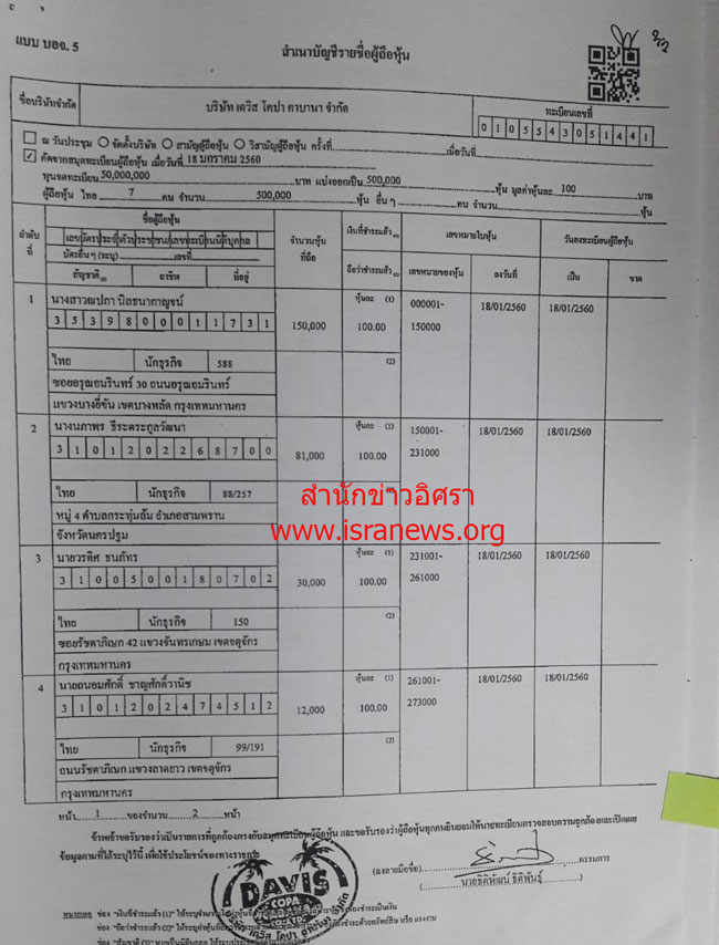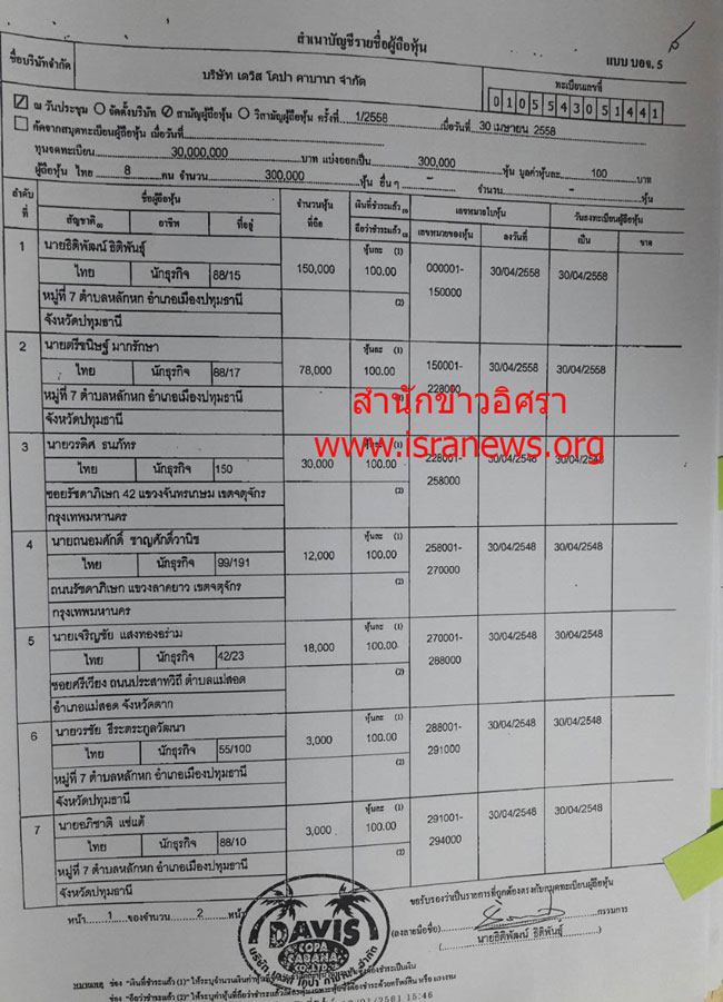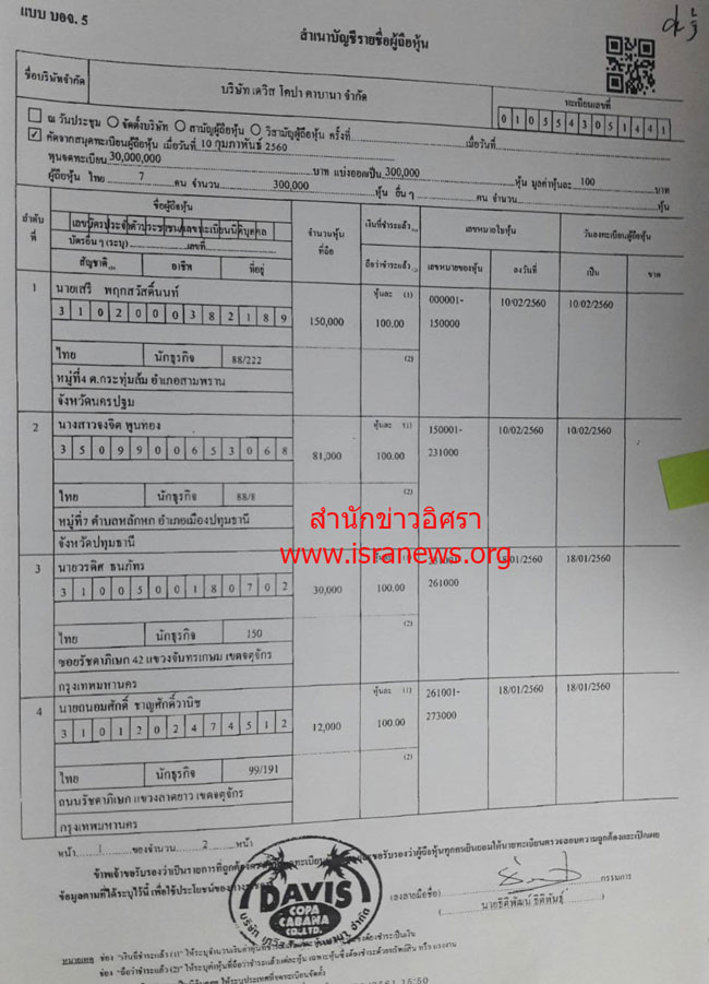 ดูชัดๆ พบชื่อ ‘เสี่ยกำพล-นิภา’ หรา! ซื้อหุ้น บ.เดวิส โคปา คาบานา ธุรกิจอาบอบนวดจาก ‘ชูวิทย์’ปี 47 นั่ง กก. โอนถ่ายเป็นทอดๆอุตลุด ช่วงปี 58-60 พบ ‘ตัวละคร’หลายคน อยู่บ้านเดียวกันกับ‘ศศิธร’ วิคตอเรีย ซีเครท ก่อนถูกหมายจับ