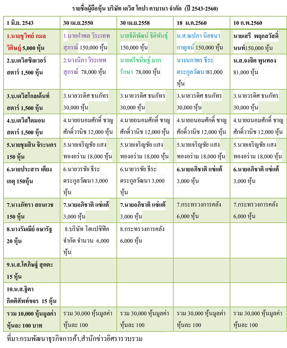 ณ วันที่ 30 เม.ย.2550 บริษัท เดวิส โคปา คาบานา จำกัด มีผู้ถือหุ้นชุดใหม่ 8 ราย ได้แก่