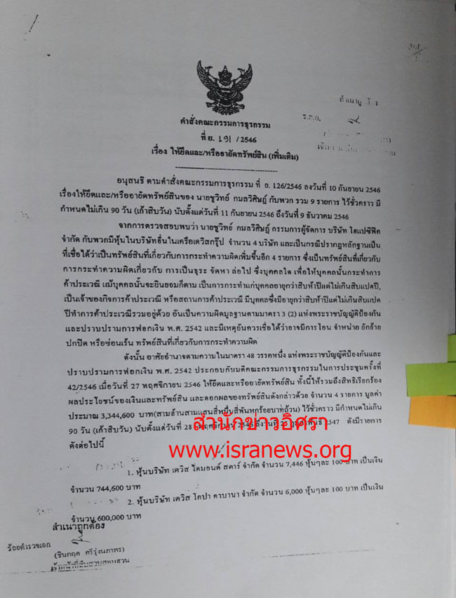 คำสั่งของคณะกรรมการธุรกรรม ปปง. ระบุว่า จากการตรวจสอบพบว่า นายชูวิทย์ กมลวิศิษฎ์ กรรมการผู้จัดการ บริษัท โฮแปซิฟิค จำกัด กับพวก มีหุ้นในบริษัทอื่นในเครือเดวิสกรุ๊ป จำนวน 4 บริษัท และเป็นกรณีปรากฎหลักฐานเป็นที่เชื่อได้ว่าเป็นทรัพย์สินที่เกี่ยวกับการกระทำความผิดเพิ่มขึ้นอีก 4 รายการ ซึ่งเป็นทรัพย์สินที่เกี่ยวกับการกระทำความผิดเกี่ยวกับการเป็นธุระ จัดหา ล่อไปซึ่งบุคคลใด เพื่อให้บุคคลนั้นกระทำการค้าประเวณี แม้บุคคลนั้นจะยินยอมก็ตาม เป็นการกระทำแก่บุคคลอายุกว่าสิบห้าปีแต่ไม่เกินสิบแปดปี ,เป็นเจ้าของกิจการค้าประเวณี หรือสถานการค้าประเวณี มีบุคคลซึ่งมีอายุกว่าสิบห้าปีแต่ไม่เกินสิบแปดปีทำการค้าประเวณีรวมอยู่ด้วย อันเป็นความผิดมูลฐานตามมาตรา 3 (2) แห่งพระราชบัญญัติป้องกันและปราบปรามการฟอกเงิน พ.ศ.2542 และมีเหตุอันควรเชื่อได้ว่าอาจมีการโอน จำหน่าย ยักย้าย ปกปิด หรือ ซ่อนเร้น ทรัพย์สินที่เกี่ยวกับการกระทำความผิด