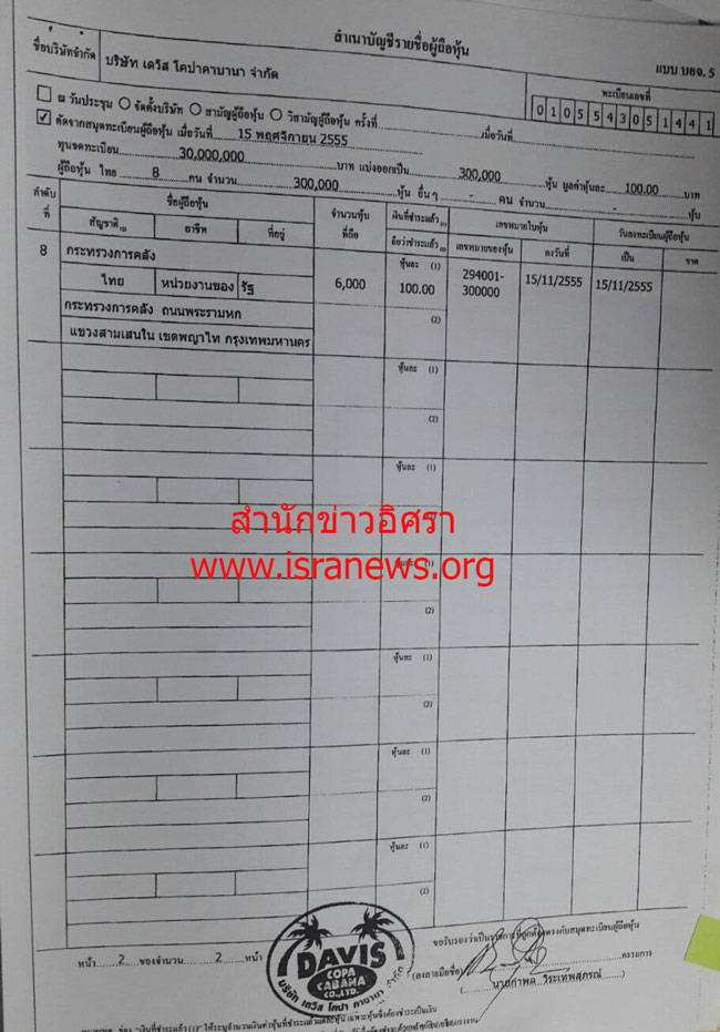 ล่าสุดสำนักข่าวอิศรา ตรวจสอบพบว่า สาเหตุที่ กระทรวงการคลัง ถือหุ้น บริษัท เดวิส โคปา คาบานา จำกัด เนื่องจากหุ้นจำนวนดังกล่าวถูกคณะกรรมการธุรกรรมของคณะกรรมการป้องกันและปราบปรามการฟอกเงิน ( ปปง.) อายัดไว้ตั้งแต่วันที่ 28 พ.ย. 2546 ต่อมาถูกโอนให้กระทรวงการคลังเมื่อวันที่ 15 พ.ย. 2555 พร้อมกับหุ้นอาบอบนวดของนายชูวิทย์อีก 3 บริษัทรวมเป็น 4 บริษัท มูลค่า 3,344,600 บาท