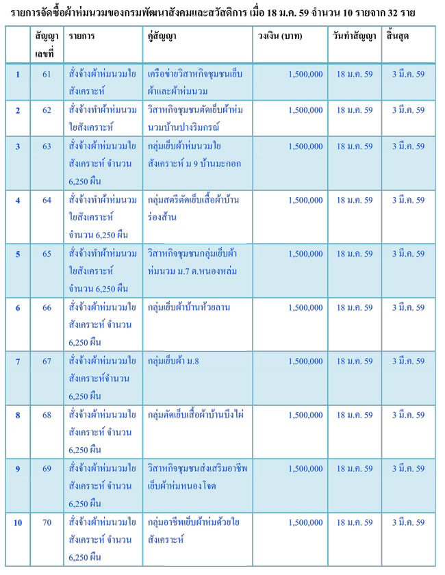วันที่ 18 ม.ค. 2559 จัดซื้อจำนวน 32 สัญญา รวม 200,000 ผืน เป็นเงิน 48,000,000 บาท