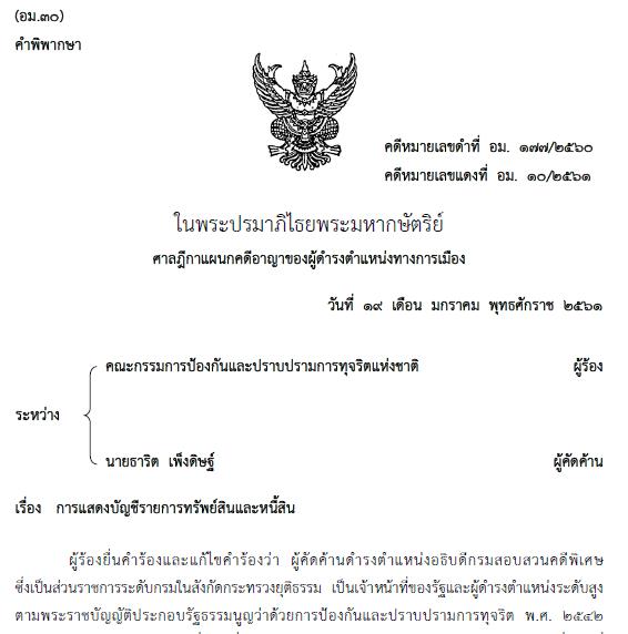 พิพากษาว่า นายธาริต เพ็งดิษฐ์ ผู้คัดค้าน จงใจยื่นบัญชีแสดงรายการทรัพย์สินและหนี้สินพร้อมเอกสารประกอบด้วยข้อความอันเป็นเท็จหรือปกปิดข้อเท็จจริงที่ควรแจ้งให้ทราบต่อคณะกรรมการ ป.ป.ช. กรณีทุกสามปีที่อยู่ในตำแหน่งผู้ดำรงตำแหน่งระดับสูง ห้ามมิให้ผู้คัดค้านดำรงตำแหน่งเจ้าหน้าที่ของรัฐเป็นเวลาห้าปีนับแต่วันที่ 3 เม.ย.2560 อันเป็นวันที่ผู้คัดค้านพ้นจากตำแหน่งที่ปรึกษา ประจำสำนักนายกรัฐมนตรี ตามพระราชบัญญัติประกอบรัฐธรรมนูญว่าด้วยการป้องกันและปราบปรามการทุจริต พ.ศ. 2542 มาตรา 41 วรรคหนึ่ง กับมีความผิดตามพระราชบัญญัติประกอบรัฐธรรมนูญว่าด้วยการป้องกันและปราบปรามการทุจริต พ.ศ. 2542 มาตรา 119 ให้จำคุก 6 เดือน และปรับ 10,000 บาท ผู้คัดค้านให้การรับสารภาพเป็นประโยชน์แก่การพิจารณา มีเหตุบรรเทาโทษ ลดโทษให้ตามประมวลกฎหมายอาญา มาตรา 78 กึ่งหนึ่ง คงจำคุก 3 เดือน และปรับ 5,000 บาท ไม่ปรากฏว่าผู้คัดค้านเคยได้รับโทษจำคุกมาก่อน ให้รอการลงโทษจำคุกไว้มีกำหนด 2 ปี ตามประมวลกฎหมายอาญา มาตรา 56 หากไม่ชำระค่าปรับให้จัดการตามประมวลกฎหมายอาญา มาตรา 29, 30. ( คดีหมายเลขแดงที่ อม. 10/2561 -19 ม.ค.2561)