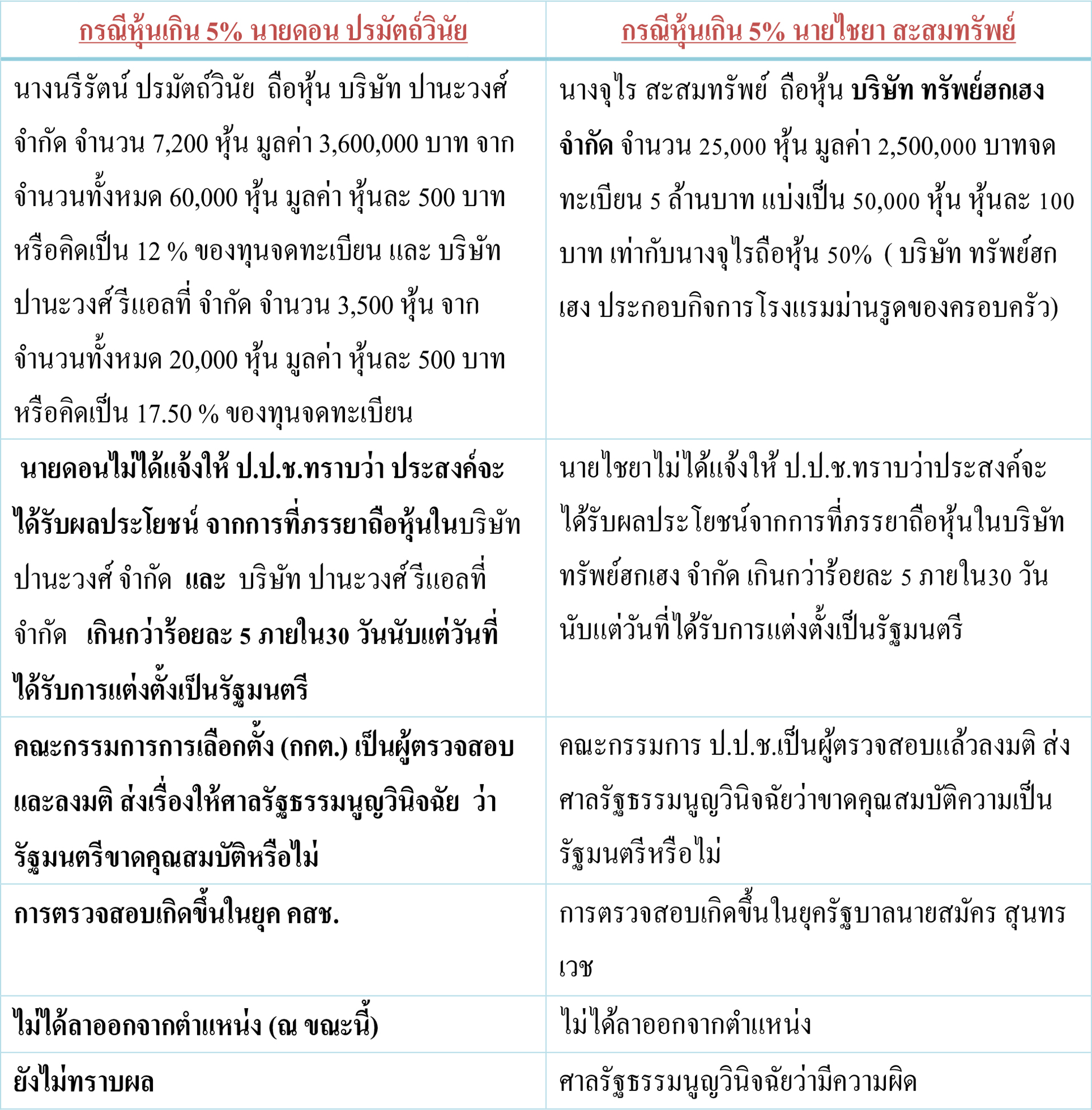 จากข้อมูลเห็นได้ว่าทั้งสองคนมีข้อเท็จจริงคล้ายกัน เป็นกรณีการถือหุ้นของคู่สมรส เกินจำนวนกว่ากฎหมายกำหนด และไม่แจ้งต่อ คณะกรรมการป้องกันและปราบปรามการทุจริตแห่งชาติ (คณะกรรมการ ป.ป.ช.) ภายในเวลาที่กำหนด ตามพระราชบัญญัติการจัดการหุ้นส่วนและหุ้นของรัฐมนตรี พ.ศ. 2543 แต่มีความแตกต่างกันตรง ต้นเรื่องในการตรวจสอบ (คนชง)