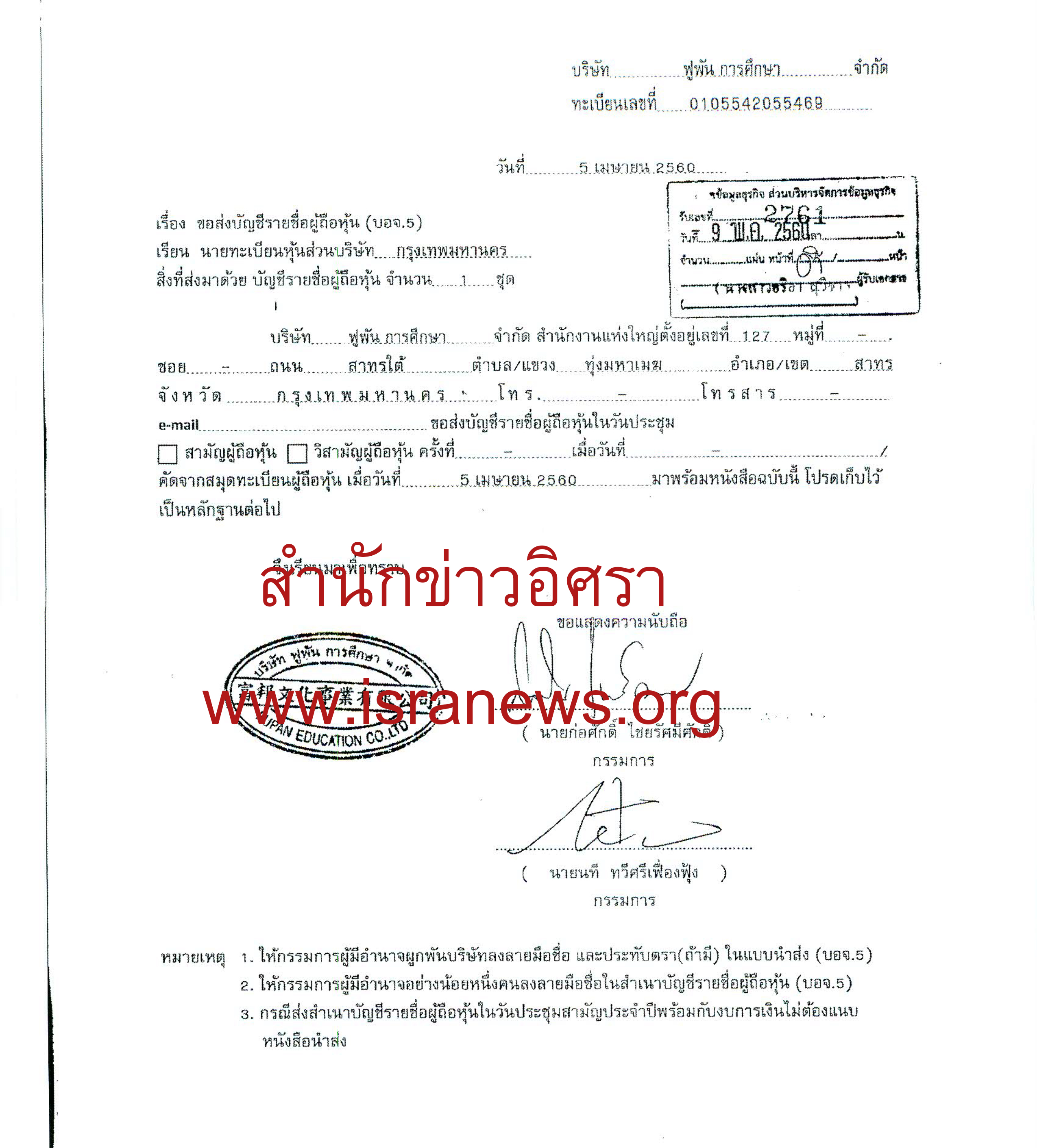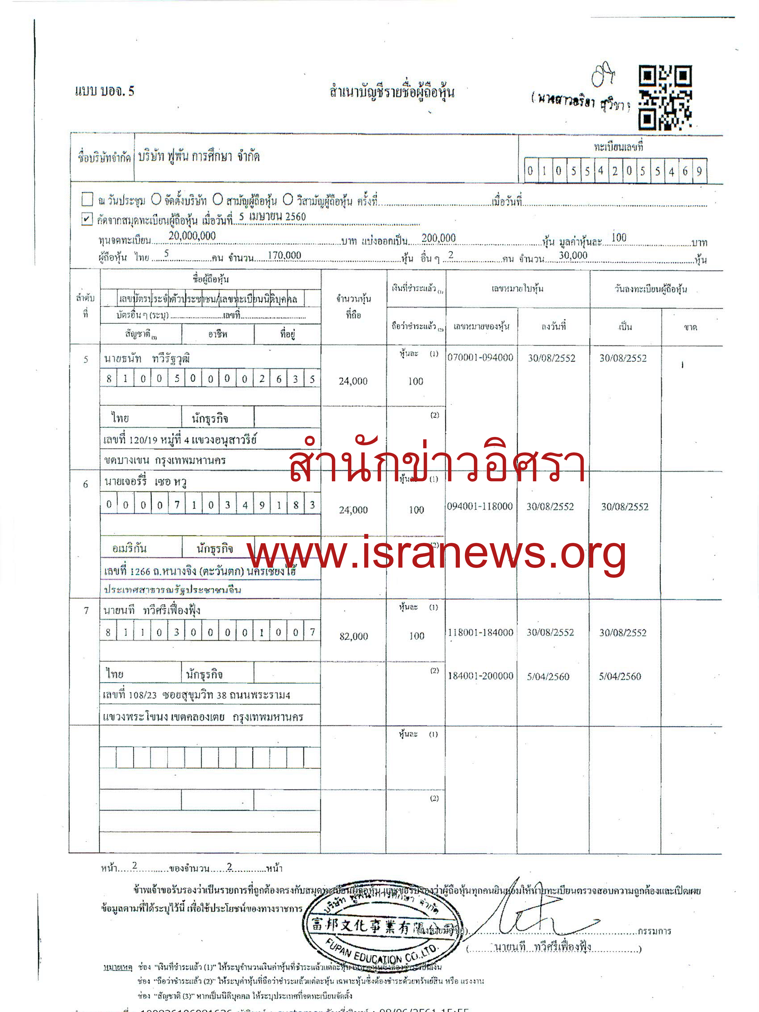 สำนักข่าวอิศรา www.isranews.org ตรวจสอบว่า เมื่อวันที่ 5 เม.ย.2560 นายอภิศักดิ์ ตันติวรวงศ์ ได้โอนหุ้น บริษัท ฟูพัน การศึกษา จำกัด จำนวน 6,000 หุ้น มูลค่าหุ้นละ 100 บาท ไปให้นายณรงค์ศักดิ์ โรจนศิริปัญญากุล ทำให้นายอภิศักดิ์ไม่ได้ถือหุ้นบริษัทดังกล่าวอีกต่อไป และบริษัทฯทำหนังสือถึงนายทะเบียนหุ้นส่วนบริษัทกรุงเทพฯ ส่งบัญชีรายชื่อผู้ถือหุ้น (บอจ.5) เมื่อวันที่ 5 เม.ย.2560