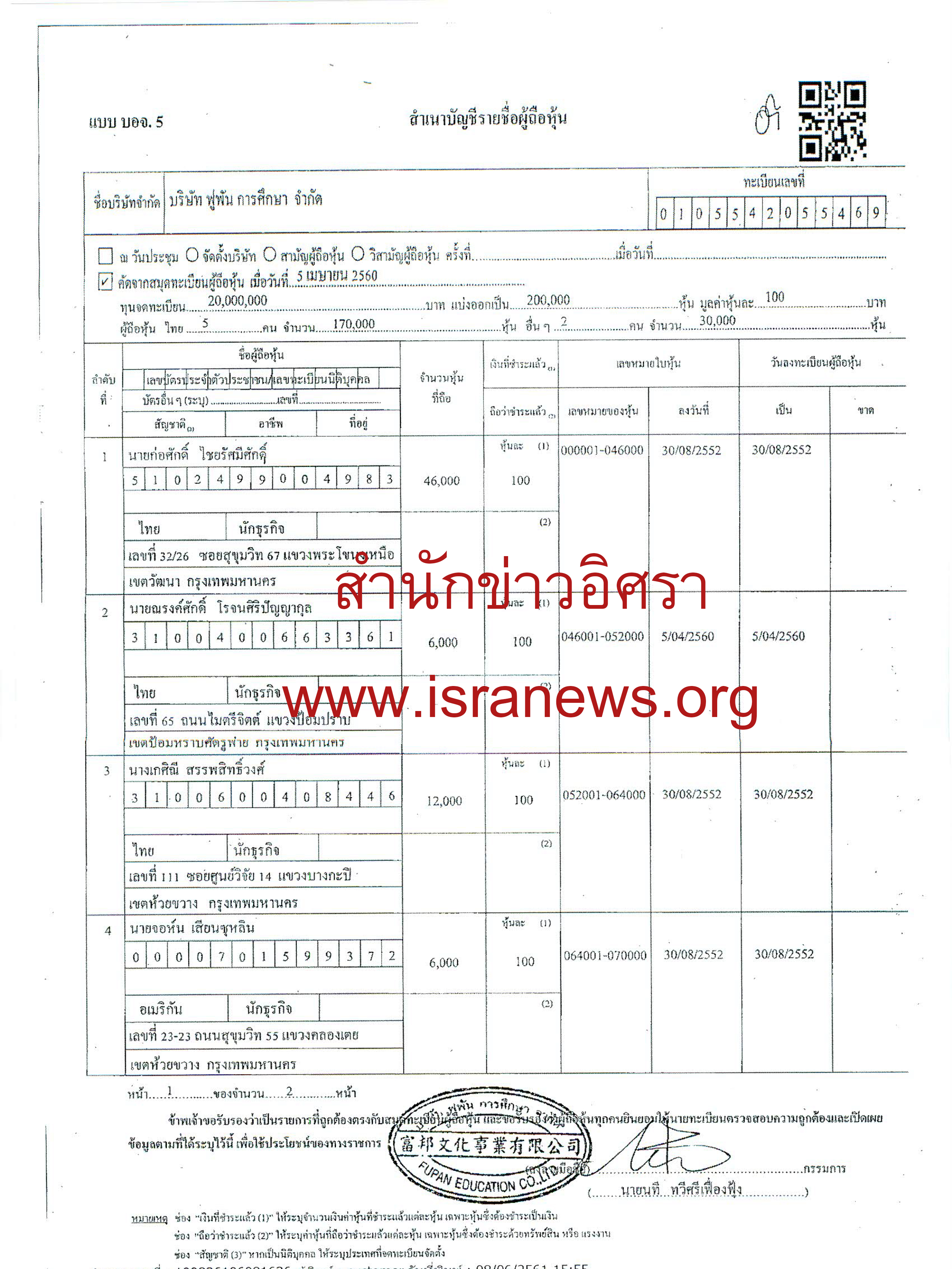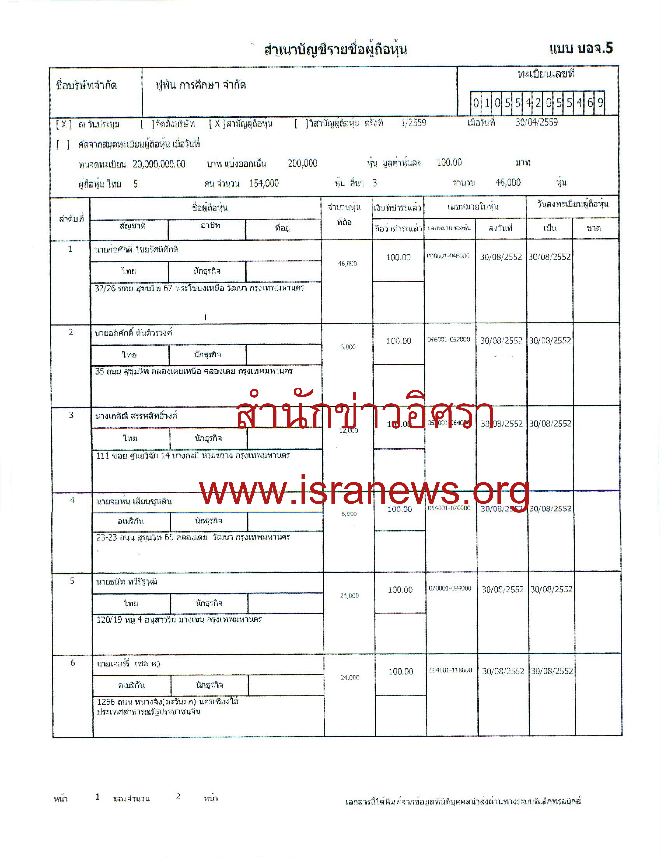ณ วันที่ 30 เม.ย.2559 มีผู้ถือหุ้น 8 คน นายก่อศักดิ์ 46,000 หุ้น นายนที ทวีศรีเฟื่องฟุ้ง 66,000 หุ้น นายอภิศักดิ์ ตันติวรวงศ์ 6,000 หุ้น และคนอื่น อีก 5 คน (ดูเอกสารและตารางประกอบ)