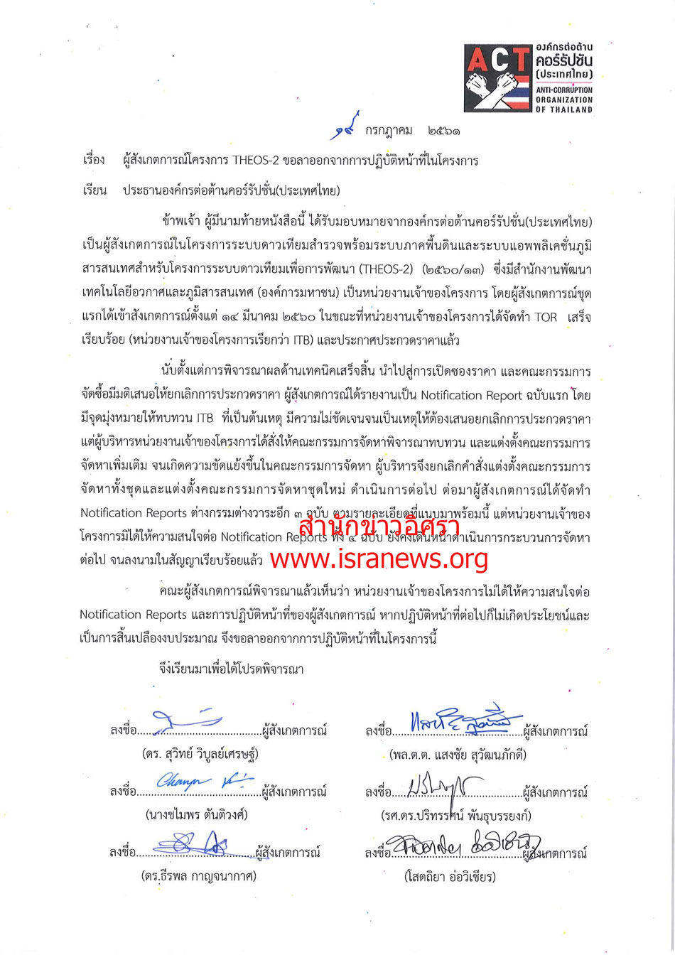สืบเนื่องจากสำนักข่าวอิศรา www.isranes.org รายงานว่า เมื่อวันที่ 24 ก.ค.2561 นายวิชัย อัศรัสกร รองประธานองค์กรต่อต้านคอร์รัปชัน (ประเทศไทย) ได้ทำหนังสือถึง ผู้อำนวยการสำนักงานพัฒนาเทคโนโลยีอวกาศและภูมิสารสนเทศ (GISTDA) เพื่อแจ้งให้ทราบเกี่ยวกับการลาออกของคณะผู้สังเกตการณ์ จำนวน 6 ราย ที่ องค์กรต่อต้านคอร์รัปชัน (ประเทศไทย) ส่งเข้าไปร่วมสังเกตการณ์การดำเนินงานโครงการระบบดาวเทียมสำรวจพร้อมระบบภาคพื้นดินและระบบแอพพลิเคชั่นภูมิภาคสารสนเทศ สำหรับโครงการระบบดาวเทียมสำรวจเพื่อการพัฒนา (THEOS-2) ภายหลังจากที่กระทรวงวิทยาศาสตร์และเทคโนโลยี ได้เสนอโครงการนี้เข้าร่วมในโครงการตามข้อตกลงคุณธรรม (Integrity Pact) ระบุเหตุผลว่า คณะผู้สังเกตการณ์ได้เข้าสังเกตการณ์ตั้งแต่วันที่ 14 มี.ค.2560 ถึงปัจจุบัน พิจารณาแล้วเห็นว่า หน่วยงานเจ้าของโครงการไม่ได้ให้ความสนใจต่อรายงานการแจ้งเตือน และการปฏิบัติหน้าที่ของผู้สังเกตการณ์ หากปฏิบัติหน้าที่ต่อไปก็ไม่เกิดประโยชน์และเป็นการสิ้นเปลืองงบประมาณ จึงขอลาออกจากการปฏิบัติหน้าที่ในโครงการดังกล่าว ให้มีผลตั้งแต่วันที่ 24 ก.ค.2561 เป็นต้นไป