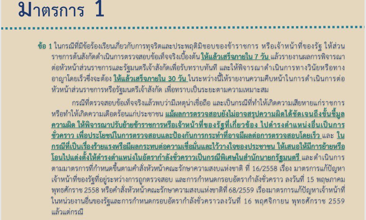 “ในกรณีที่มีข้อร้องเรียนเกี่ยวกับการทุจริตและประพฤติมิชอบของข้าราชการ หรือเจ้าหน้าที่ของรัฐ ให้ส่วนราชการต้นสังกัดดำเนินการตรวจสอบข้อเท็จจริงเบื้องต้นให้แล้วเสร็จภายใน 7 วัน แล้วรายงานผลการพิจารณาต่อหัวหน้าส่วนราชการและรัฐมนตรีเจ้าสังกัดเพื่อรับทราบทันที และให้พิจารณาดำเนินการทางวินัยหรือทางอาญาโดยเร็วซึ่งจะต้องให้แล้วเสร็จภายใน 30 วัน ในระหว่างนี้ให้รายงานความคืบหน้าในการดำเนินการต่อหัวหน้าส่วนราชการหรือรัฐมนตรีเจ้าสังกัด เพื่อทราบเป็นระยะตามความเหมาะสม