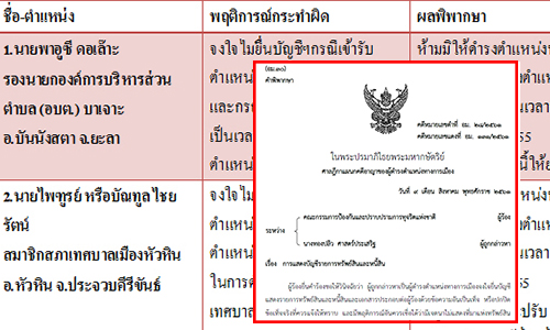 2. นายไพฑูรย์ หรือบัณทูล ไชยรัตน์ สมาชิกสภาเทศบาลเมืองหัวหิน อ.หัวหิน จ.ประจวบคีรีขันธ์ จงใจไม่ยื่นบัญชีฯ กรณีพ้นจากตำแหน่งและกรณีพ้นจากตำแหน่งมาแล้วเป็นเวลาหนึ่งปี ในการดำรงตำแหน่งสมาชิกสภาเทศบาลเมืองหัวหิน ห้ามมิให้ผู้คัดค้านดำรงตำแหน่งทางการเมืองหรือดำรงตำแหน่งใดในพรรคการเมืองเป็นเวลาห้าปี นับแต่วันที่ 3 พ.ค.2555 ซึ่งเป็นวันที่ผู้คัดค้านพ้นจากตำแหน่ง กับมีความผิดตามพระราชบัญญัติประกอบรัฐธรรมนูญว่าด้วยการป้องกันและปราบปรามการทุจริต พ.ศ. 2542 มาตรา 119 ฐานเป็นเจ้าหน้าที่ของรัฐจงใจไม่ยื่นบัญชีแสดงรายการทรัพย์สินและหนี้สินและเอกสารประกอบต่อคณะกรรมการ ป.ป.ช. ภายในเวลาที่กฎหมายกำหนดกรณีพ้นจากตำแหน่งมาแล้วเป็นเวลา หนึ่งปี จำคุก 2 เดือน และปรับ 8,000 บาท ผู้คัดค้านให้การรับสารภาพ เป็นประโยชน์แก่ การพิจารณา มีเหตุบรรเทาโทษ ลดโทษให้กึ่งหนึ่ง คงจำคุก 1 เดือน และปรับ 4,000 บาท ไม่ปรากฏว่าผู้คัดค้านเคยได้รับโทษจำคุกมาก่อน โทษจำคุกจึงให้ รอการลงโทษไว้มีกำหนด 1 ปี และคำขออื่นนอกจากนี้ให้ยก. (คดีหมายเลขแดงที่ อม.173/2560 -2 ส.ค.2561)