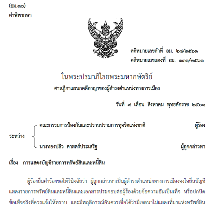 พิพากษาว่า นางทองปลิว ศาสตร์ประเสริฐ ผู้ถูกกล่าวหาจงใจยื่นบัญชีแสดงรายการทรัพย์สินและหนี้สินและเอกสารประกอบต่อคณะกรรมการ ป.ป.ช. ด้วยข้อความอันเป็นเท็จหรือปกปิดข้อเท็จจริงที่ควรแจ้งให้ทราบ กรณีเข้ารับตำแหน่ง กรณีพ้นจากตำแหน่ง และกรณีพ้นจากตำแหน่งมาแล้วเป็นเวลาหนึ่งปี ในการดำรงตำแหน่งรองนายก อบต.บางขนุน ครั้งที่ 1 และกรณีเข้ารับตำแหน่งรองนายก อบต.บางขนุน ครั้งที่ 2 ให้ผู้ถูกกล่าวหา พ้นจากตำแหน่งรองนายก อบต.บางขนุน ครั้งที่ 2 ที่ดำรงอยู่ในวันที่ 11 เม.ย.2561 ซึ่งเป็นวันที่ศาลฎีกาแผนกคดีอาญาของผู้ดำรงตำแหน่งทางการเมืองมีคำสั่งให้ผู้ถูกกล่าวหา หยุดปฏิบัติหน้าที่ ตามพระราชบัญญัติประกอบรัฐธรรมนูญว่าด้วยวิธีพิจารณาคดีอาญาของผู้ดำรงตำแหน่งทางการเมือง พ.ศ. 2560 มาตรา 17 วรรคสอง และห้ามมิให้ผู้ถูกกล่าวหาดำรงตำแหน่งทางการเมืองหรือดำรงตำ แหน่งใดในพรรคการเมืองเป็นเวลาห้าปีนับแต่วันที่ 9 ส.ค.2561 ซึ่งเป็นวันที่ศาลฎีกาแผนกคดีอาญาของผู้ดำรงตำแหน่งทางการเมืองวินิจฉัย กับมีความผิดตามพระราชบัญญัติประกอบรัฐธรรมนูญว่าด้วยการป้องกัน และปราบปรามการทุจริต พ.ศ. 2542 มาตรา 119 การกระทำของผู้ถูกกล่าวหาเป็นความผิดหลายกรรมต่างกัน ให้ลงโทษทุกกรรมเป็นกระทงความผิดไปจำคุกกระทงละ 2 เดือน และปรับกระทงละ 8,000 บาท รวม 4 กระทง เป็นจำคุก 8 เดือนและปรับ 32,000 บาท ผู้ถูกกล่าวหาให้การรับสารภาพ เป็นประโยชน์แก่การพิจารณา มีเหตุบรรเทาโทษลดโทษให้กึ่งหนึ่ง คงจำคุก 4 เดือน และปรับ 16,000 บาท ไม่ปรากฏว่าผู้ถูกกล่าวหาเคยได้รับโทษจำคุกมาก่อน โทษจำคุกจึงให้รอการลงโทษไว้มีกำหนด 1 ปี (คดีหมายเลขแดงที่ อม.131/2561 -9 ส.ค.2561)