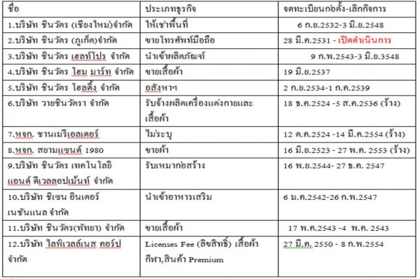 1.บริษัท ชินวัตร (เชียงใหม่)จำกัด จดทะเบียนวันที่ 6 ก.ย.2532 ทุน 50 ล้านบาท
