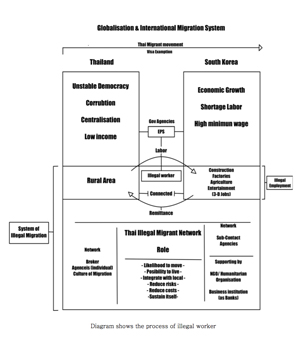 ท้ายที่สุด วิทยานิพนธ์เรื่องนี้สรุปว่า การเกิดของแรงงานผิดกฎหมายนั้น เกิดขึ้นตามระบบของสังคมเศรษฐกิจ ที่มีความซับซ้อนสูง จากงานวิจัยจะเห็นว่าเป็นปัญหาระดับโลกาภิวัฒน์ ทั้งการเมืองไทย การเมืองเกาหลี เศรษฐกิจโลก แรงงานที่ตัดสินใจไปทำงานแบบผิดกฎหมาย โดยส่วนมากจึงอยู่ในสถานะความยากจนที่ขาดการเข้าถึงสิทธิขั้นพื้นฐานทางสังคม อาทิ การศึกษา พยาบาล และเป็นสถานะที่คนไม่สามารถพึ่งพารัฐบาลเพื่อแก้ไขปัญหาเหล่านี้