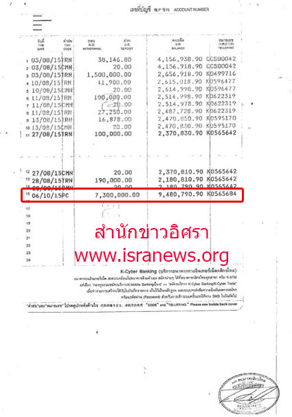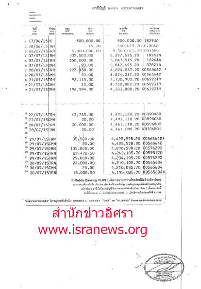 จากการตรวจสอบเงินหมุนเวียนในบัญชีฯย้อนหลังพบว่ายอดเงิน ณ วันที่ 17 มิ.ย.2558 (17/06/15) จำนวน 500,000 บาท หลังจากนั้นได้เพิ่มขึ้น ยอดสูงสุดอยู่ที่ 5,397,515,20 บาท มียอดเบิกถอนสูงสุดอยู่ที่ 1,500,000 บาท วันที่ 3 ส.ค.2558 (วันที่ 03/08/15) ยอดคงเหลือ ณวันที่ 28 ส.ค.2558 (28/08/15) จำนวน 2,180,790 บาท ก่อนฝากเพิ่มเมื่อวันที่ 6 ต.ค.2558 (06/10/15) จำนวน 7,300,000 บาท (ดูเอกสาร)