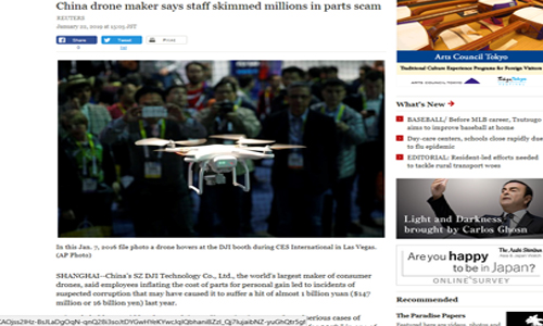 ทั้งนี้ สำนักข่าว Asahi ของญี่ปุ่น รายงานข่าวกรณีบริษัท DJI Technology หรือ DJI ซึ่งเป็นบริษัทที่ผลิตโดรนหรืออากาศยานบังคับวิทยุไร้คนขับขนาดใหญ่ที่สุดของประเทศจีน ได้ออกมายอมรับว่าพนักงานของบริษัทนั้นอาจจะมีส่วนร่วมในการฉ้อโกงราคาชิ้นส่วนของอุปกรณ์เพื่อผลประโยชน์ส่วนตัว จนทำให้เกิดพฤติกรรมต้องสงสัยว่าจะมีการทุจริตที่มีความเสียหายมูลค่าสูงถึง 1 พันล้านหยวนหรือประมาณ 4,673 ล้านบาท ในช่วงปีที่ผ่านมา