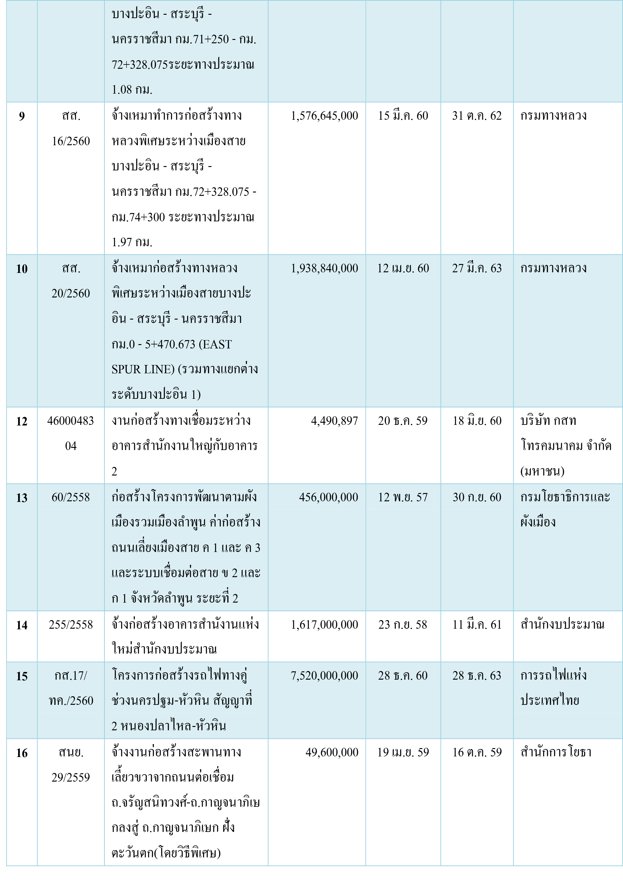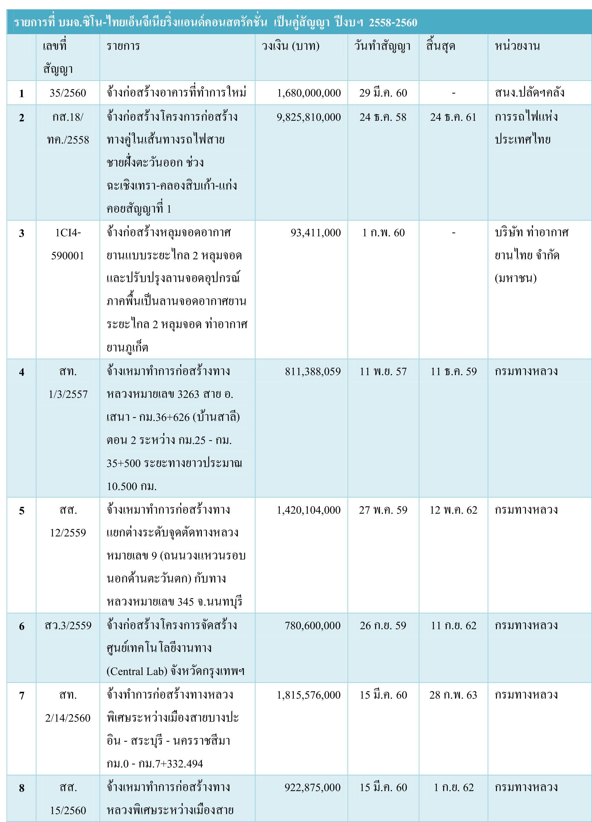 ข้อมูลการเป็นสัญญารับเหมากับหน่วยงานรัฐ จากการตรวจสอบพบว่าในช่วงปีงบประมาณ 2558-2560 บมจ.ซิโน-ไทยเอ็นจีเนียริ่งแอนด์คอนสตรัคชั่น เป็นคู่สัญญากับหน่วยงานรัฐ รวมทังสิ้น 16 สัญญา รวมวงเงิน 30,555,239,956 บาท ในจำนวนนี้เป็นคู่สัญญาหน่วยงานในกระทรวงคมนาคม 11 สัญญา วงเงินรวม 26,748,149,059 บาท (เท่าที่ตรวจพบ)