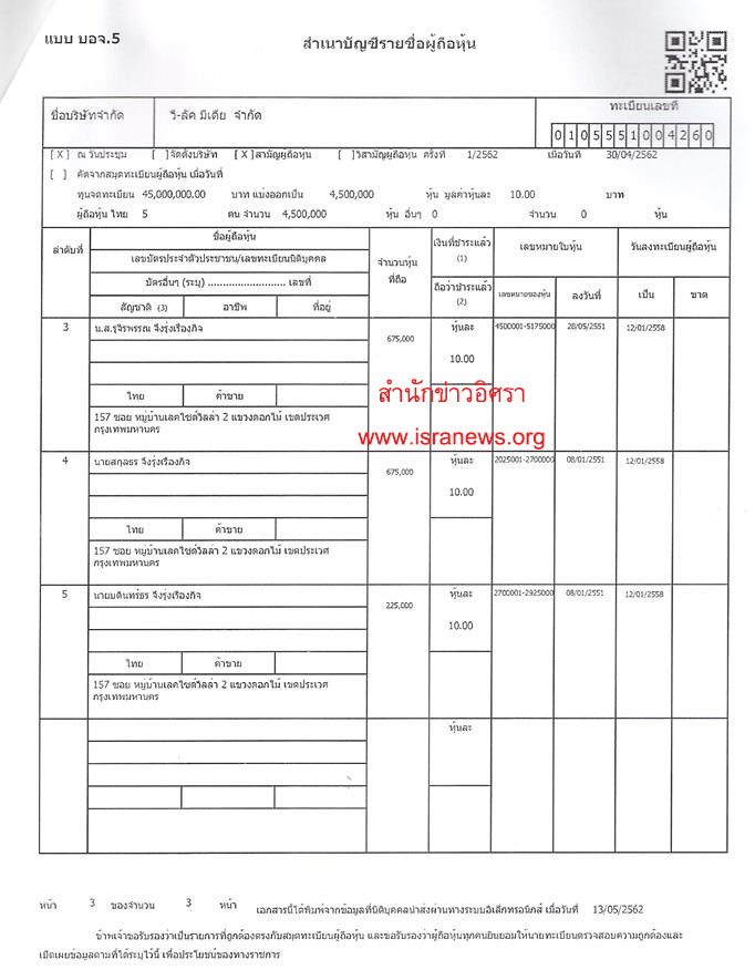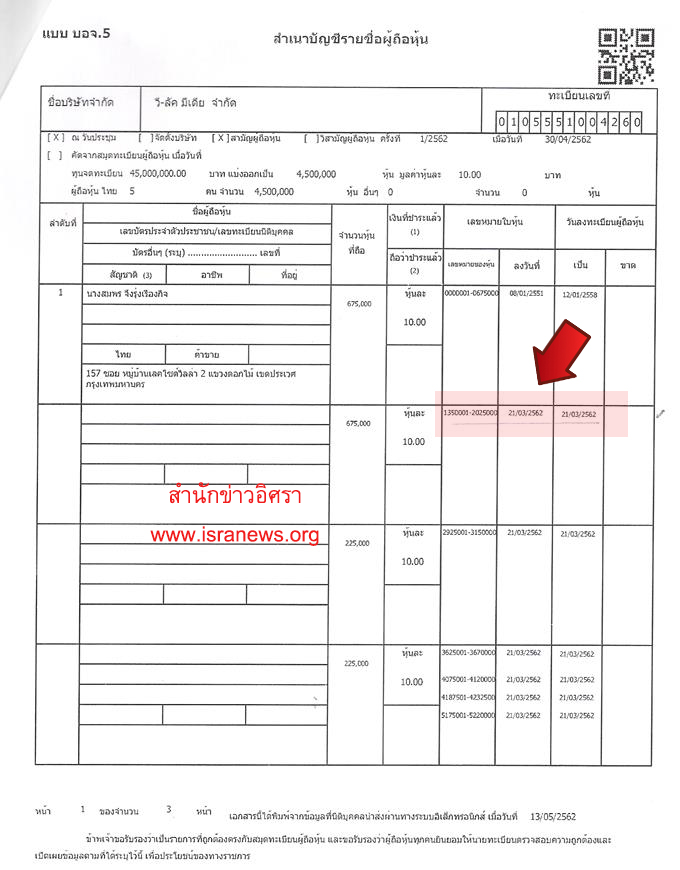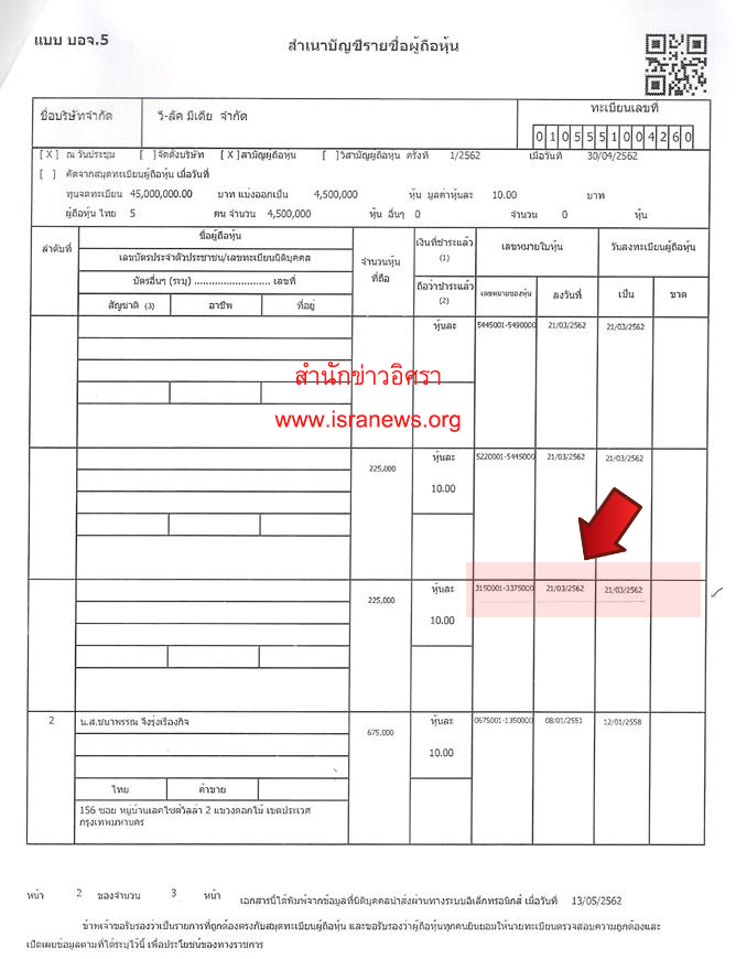 บ.วี-ลัค มีเดีย ส่งบัญชีผู้ถือหุ้น กรมพัฒนาธุรกิจฯ ล่าสุด 13 พ.ค.62 ณ วันประชุม 30 เม.ย.62 หมายเลขหุ้น ‘ธนาธร-เมีย’ ระบุวันลงทะเบียน 21 มี.ค.62 เหมือนเดิม