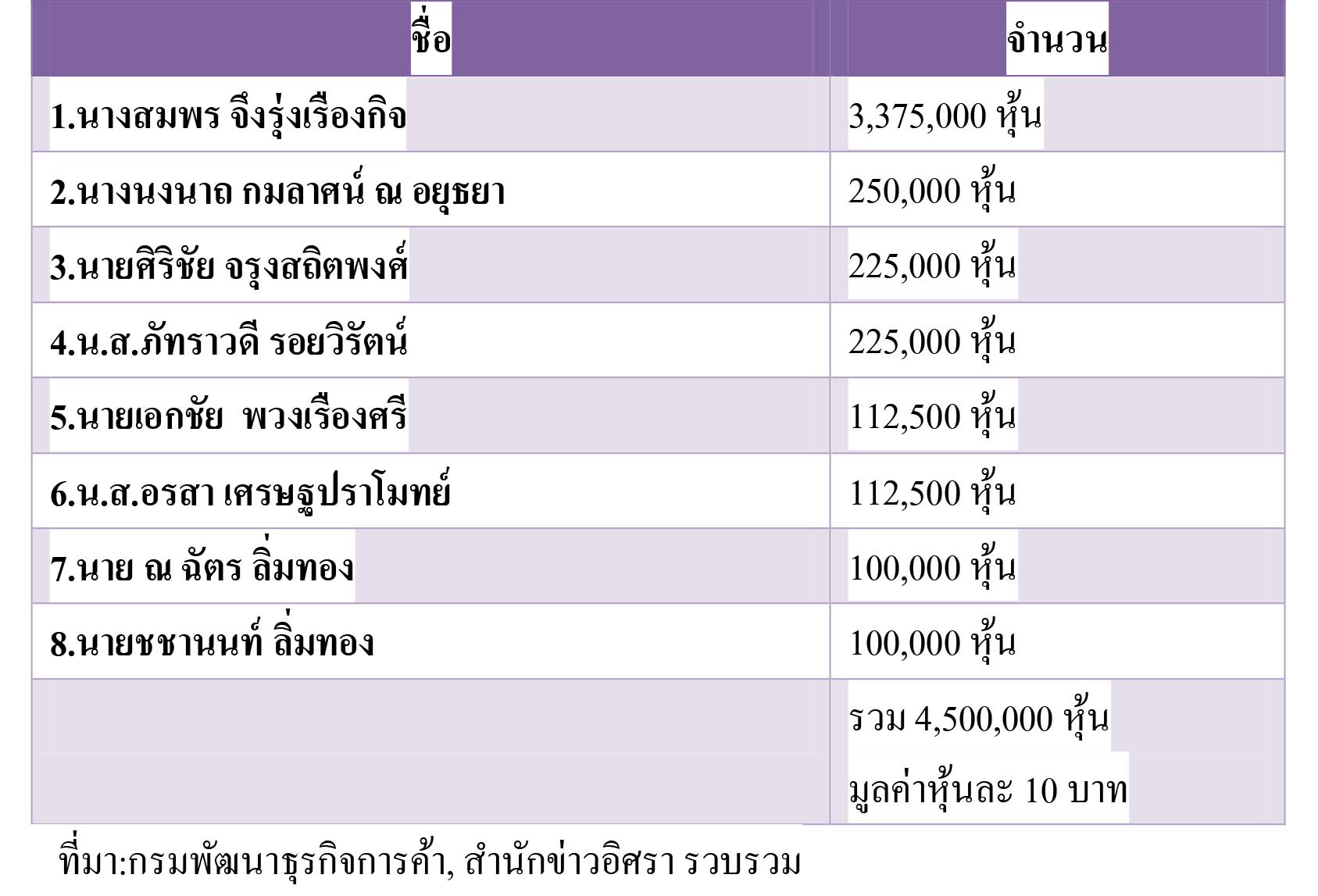วันที่ 25 ธ.ค.2551 มีผู้ถือหุ้น จำนวน 6 คน นางสมพร จึงรุ่งเรืองกิจ ถือหุ้นใหญ่ 3,600,000 หุ้น นางนงนาถ กมลาศน์ ณ อยุธยา ถอนหุ้นออก 225,000 หุ้น และโอนให้นางสมพร