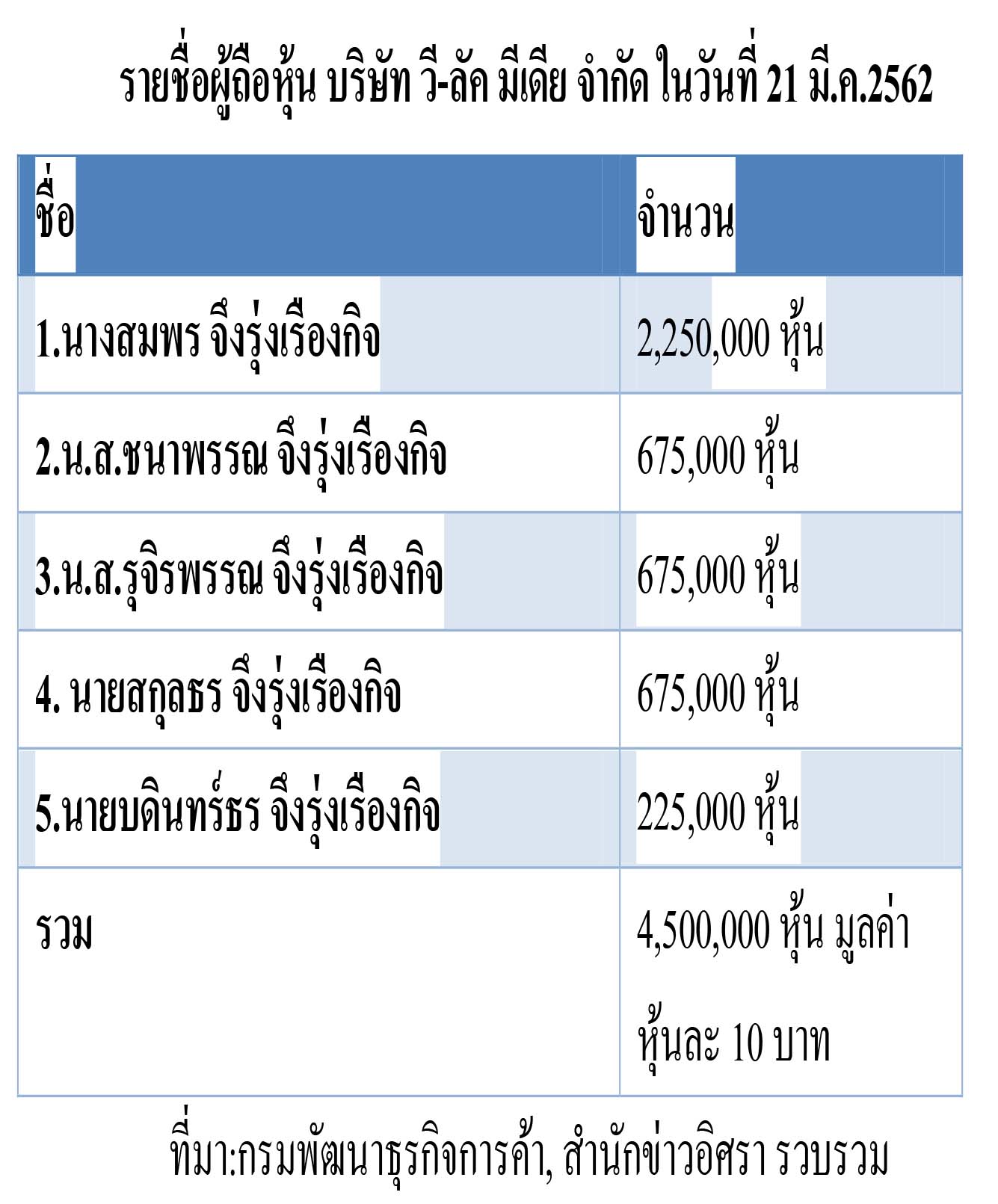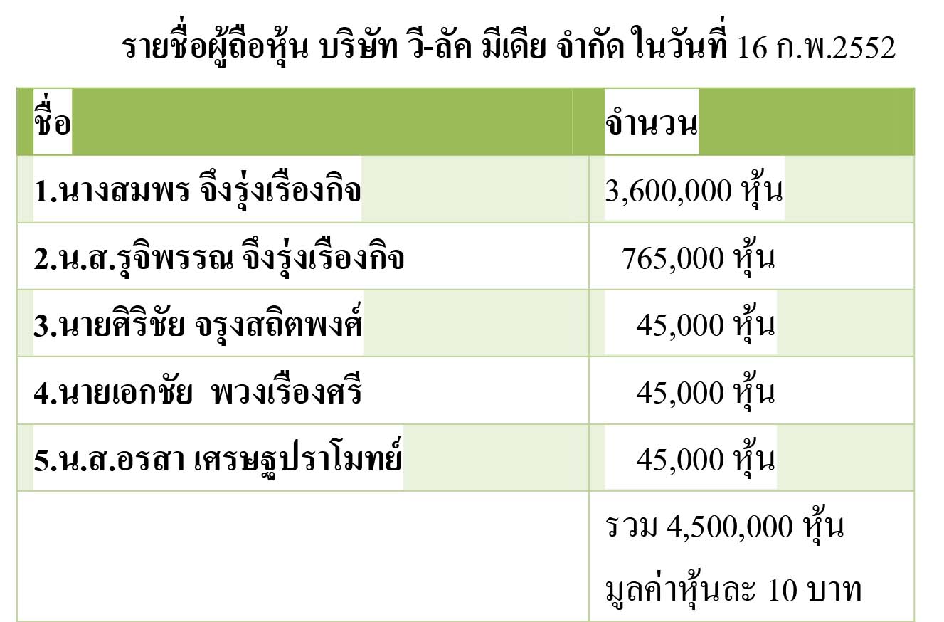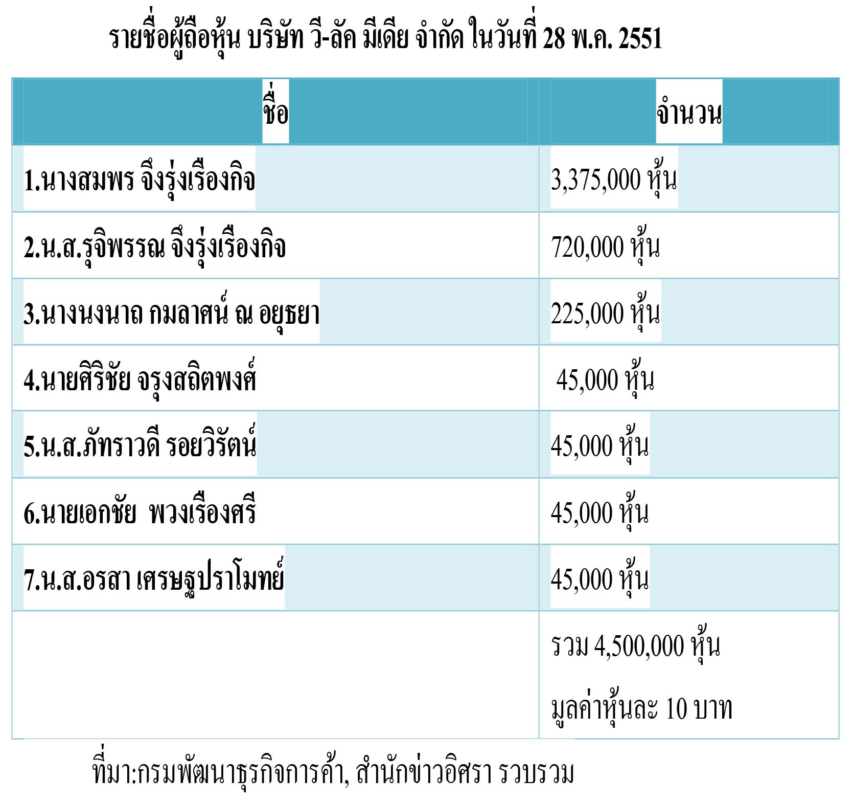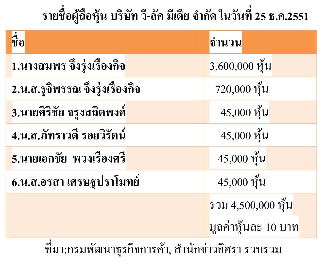 รายชื่อผู้ถือหุ้น บริษัท โซลิต (ประเทศไทย) จำกัด หรือ บริษัท วี-ลัค มีเดีย จำกัด ในวันก่อตั้ง 8 ม.ค.2551