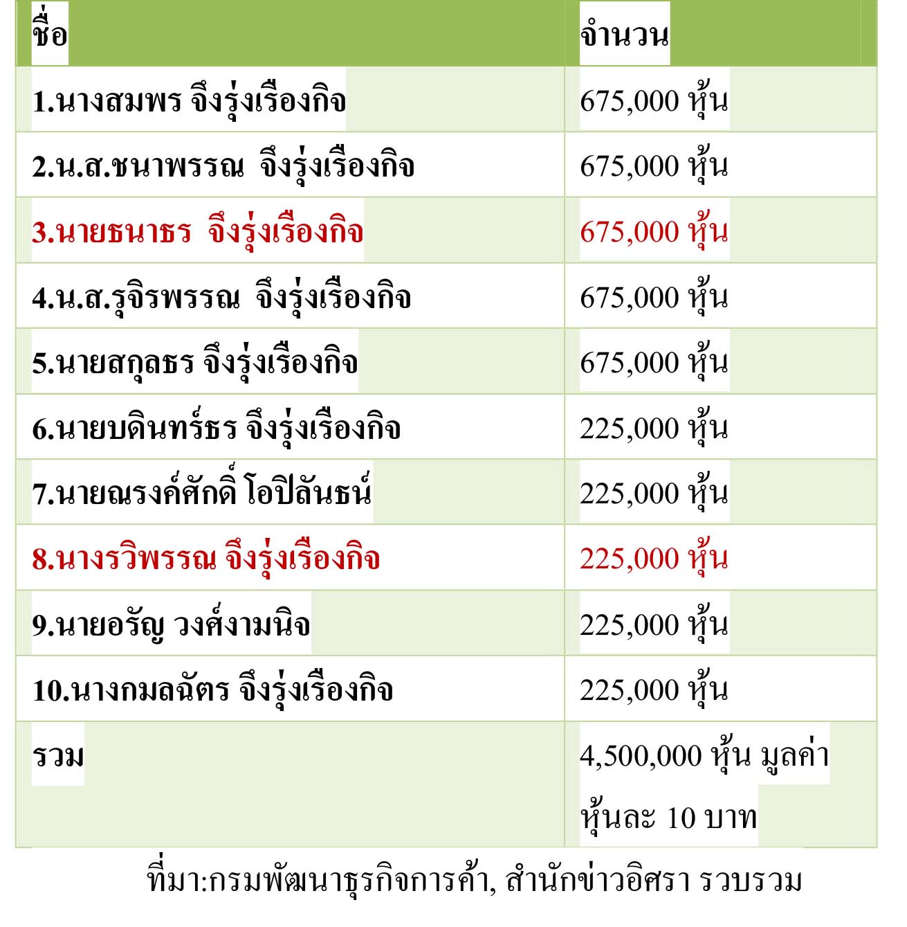 บัญชีผู้ถือหุ้น ณ วันที่ 21 มี.ค.2562 มีผู้ถือหุ้นจำนวน 5 คน 1.นางสมพร จึงรุ่งเรืองกิจ 2,250,000 หุ้ 2.น.ส.ชนาพรรณ จึงรุ่งเรืองกิจ 675,000 หุ้น 3.น.ส.รุจิรพรรณ จึงรุ่งเรืองกิจ 675,000 หุ้น 4. นายสกุลธร จึงรุ่งเรืองกิจ 675,000 หุ้น และ 5.นายบดินทร์ธร จึงรุ่งเรืองกิจ 225,000 หุ้น (หุ้นเดิมของนายธนาธร นางรวิพรรณ ภรรยา นายณรงค์ศักดิ์ โอปิลันธน์ นายอรัญ วงศ์งามนิจ และ นางกมลฉัตร จึงรุ่งเรืองกิจ รวม 5 คน ถูกโอนไปให้นางสมพร)