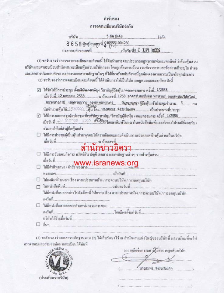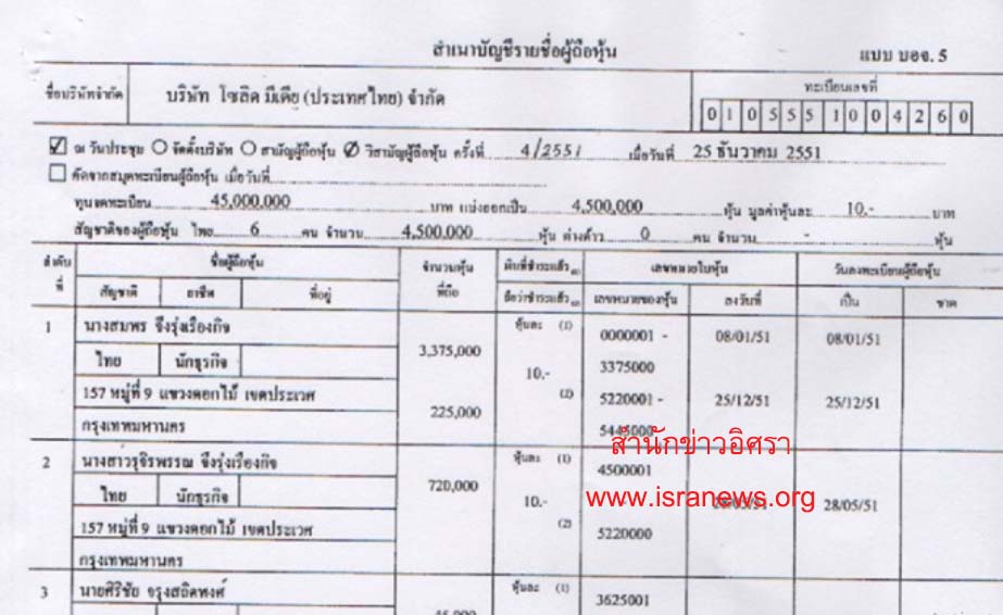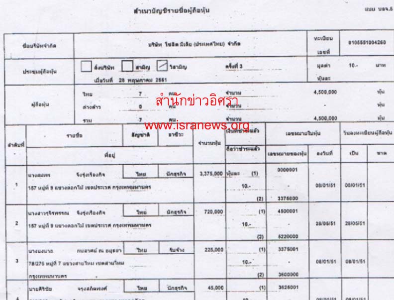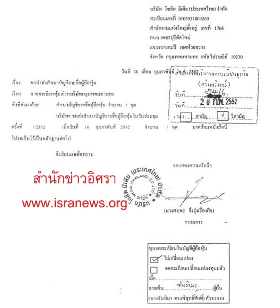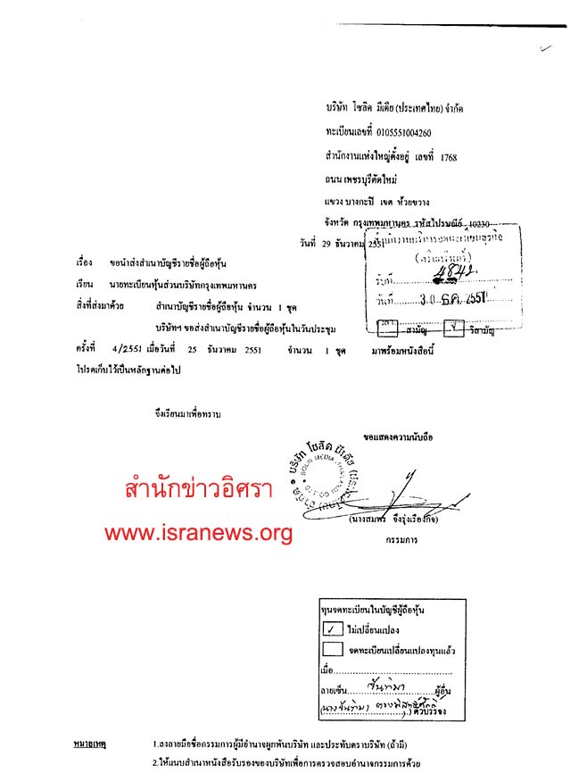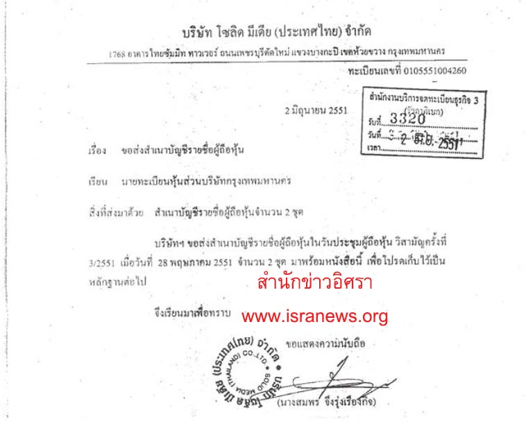 วันที่ 2 มิ.ย.2551 นางสมพร จึงรุ่งเรืองกิจ ในฐานะกรรมการ นำส่งสำเนาบัญชีรายชื่อผู้ถือหุ้นต่อนายทะเบียนหุ้นส่วนบริษัทกรุงเทพมหานคร สำนักงานบริการจดทะเบียนธุรกิจ 3 (รัชดาภิเษก) ประทับรับหนังสือวันที่ 2 มิ.ย.2551 ระบุ “บริษัทฯ ขอส่งสำเนาบัญชีรายชื่อผู้ถือหุ้นในวันประชุมผู้ถือหุ้น วิสามัญครั้งที่ 3/2551 เมื่อวันที่ 28 พฤษภาคม 2551 จำนวน 2 ชุด มาพร้อมหนังสือนี้ เพื่อโปรดเก็บไว้เป็นหลักฐานต่อไป” (ดูเอกสาร)
