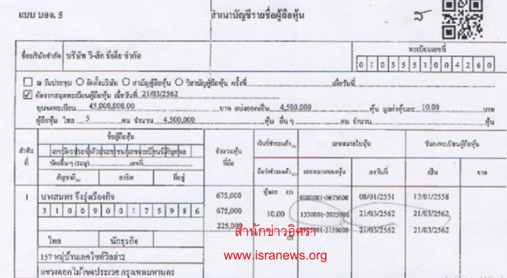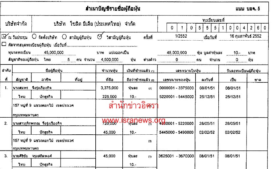 นับตั้งแต่จดทะเบียนก่อตั้งเมื่อวันที่ 8 ม.ค. 2551- 21 มี.ค.2562 มีการเปลี่ยนแปลงผู้ถือหุ้น 5 ครั้ง ในการเปลี่ยนแปลงแต่ละครั้ง ปรากฎว่า 4 ครั้ง บริษัทฯนำส่งสำเนาบัญชีรายชื่อผู้ถือหุ้น (บอจ.5) ต่อนายทะเบียนหุ้นส่วนบริษัทกรุงเทพมหานคร กรมพัฒนาธุรกิจการค้า ได้แก่ ครั้งที่ 1- ครั้งที่ 4 ระบุ สำเนาบัญชีรายชื่อผู้ถือหุ้นในวันประชุมวิสามัญผู้ถือหุ้น ยกเว้นการเปลี่ยนแปลงผู้ถือหุ้นครั้งที่ 5 เมื่อวันที่ 21 มี.ค.2562 เท่านั้น ที่ ไม่ได้ระบุว่า เป็นบัญชีรายชื่อผู้ถือหุ้นในวันประชุมผู้ถือหุ้นวิสามัญ แต่ระบุว่า “คัดมาจากทะเบียนผู้ถือหุ้น เมื่อวันที่ 21 มี.ค.2562”