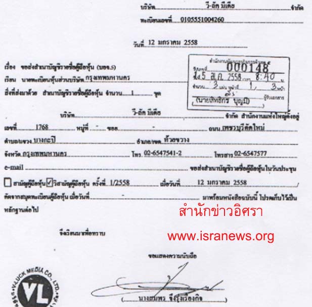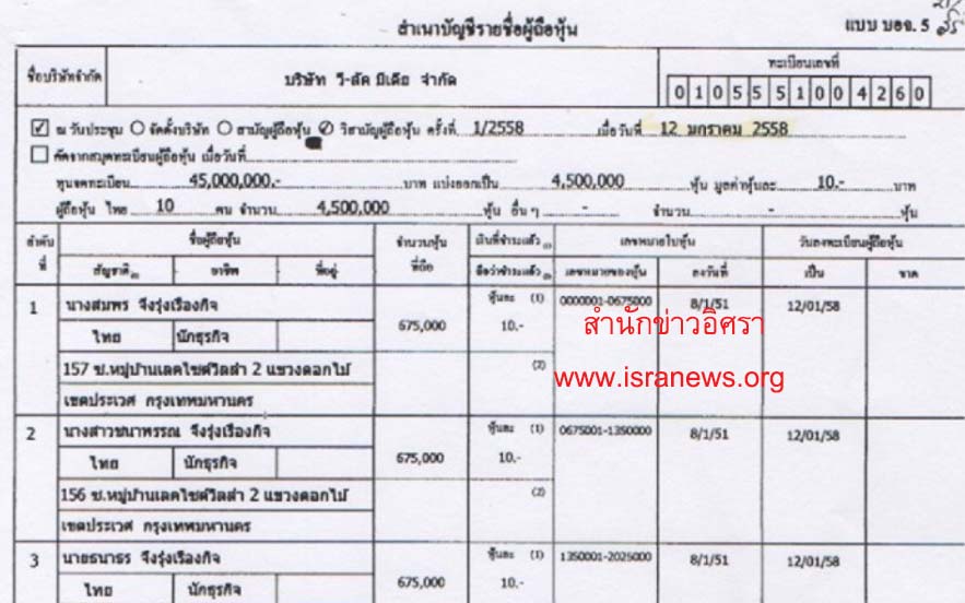 12 ม.ค.2558 นางสมพร จึงรุ่งเรืองกิจ ในฐานะกรรมการ นำส่งสำเนาบัญชีรายชื่อผู้ถือหุ้น (บอจ.5) ต่อนายทะเบียนหุ้นส่วนบริษัทกรุงเทพมหานคร ระบุ “ขอนำส่งสำเนาบัญชีรายชื่อผู้ถือหุ้นในวันประชุม วิสามัญผู้ถือหุ้น ครั้ง 1/2558 เมื่อวันที่ 12 มกราคม 2558 คัดจากสมุดทะเบียนผู้ถือหุ้นเมื่อวันที่ – มาพร้อมหนังสือฉบับนี้ โปรดเก็บไว้เป็นหลักฐานต่อไป” สำนักงานพัฒนาธุรกิจการค้าเขต 5 ประทับรับหนังสือวันที่ 15 ม.ค.2558 (ดูเอกสาร)