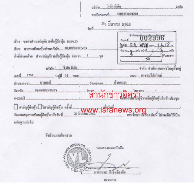 เปิดเอกสารนำส่งสำเนาผู้ถือหุ้น บ.วี-ลัค มีเดีย 5 ฉบับ 2551-2562 พบ 4 ครั้ง มีการประชุมวิสามัญผู้ถือหุ้น ยกเว้น 21 มี.ค.62 ไม่มีหนังสือรับรองการประชุม ระบุ“คัดมาจากทะเบียนผู้ถือหุ้น เมื่อวันที่ 21 มี.ค.2562” เหตุอันควรสงสัย ปมศาลรัฐธรรมนูญรับคำร้อง กกต.คดี‘ธนาธร’